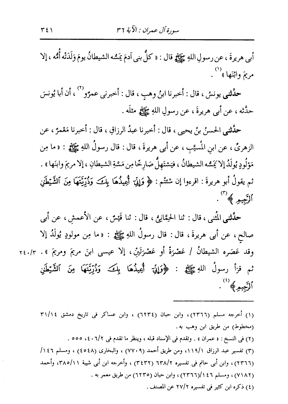 حَدَّثَنِي الْمُثَنَّى، قَالَ: ثنا الْحِمَّانِيُّ، قَالَ: ثنا قَيْسٌ، عَنِ الْأَعْمَشِ، عَنْ أَبِي صَالِحٍ، عَنْ أَبِي هُرَيْرَةَ، قَالَ: قَالَ رَسُولُ اللَّهِ صَلَّى اللهُ عَلَيْهِ وَسَلَّمَ: «§مَا مِنْ مَوْلُودٍ يُولَدُ إِلَّا وَقَدْ عَصَرَهُ الشَّيْطَانُ عَصْرَةً أَوْ عَصْرَتَيْنِ؛ إِلَّا عِيسَى ابْنَ مَرْيَمَ وَمَرْيَمَ» ثُمَّ قَرَأَ رَسُولُ اللَّهِ صَلَّى اللهُ عَلَيْهِ وَسَلَّمَ: {إِنِّي أُعِيذُهَا بِكَ وَذُرِّيَّتَهَا مِنَ الشَّيْطَانِ الرَّجِيمِ} [آل عمران: 36]