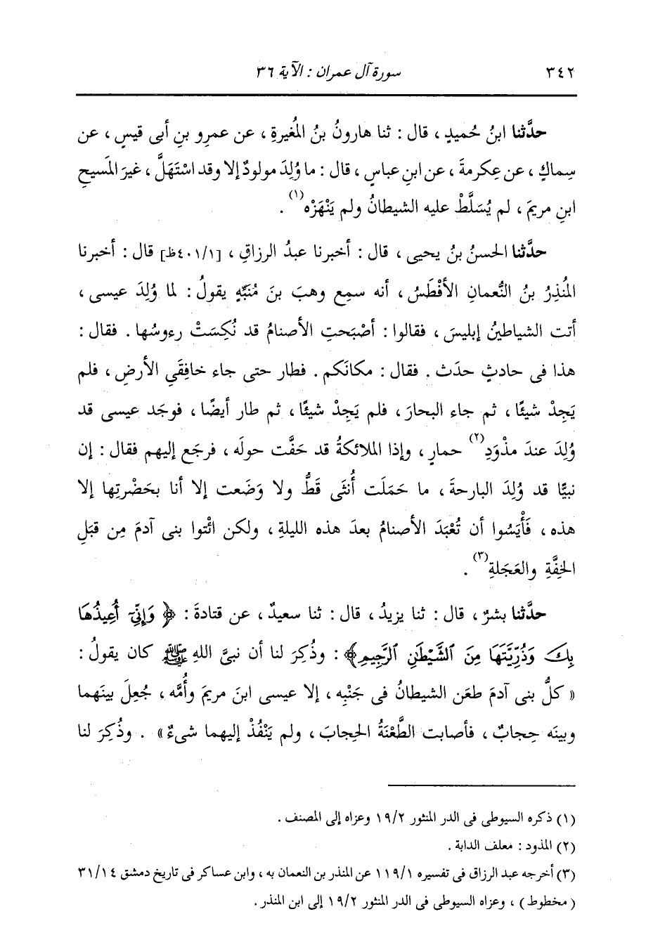 حَدَّثَنَا بِشْرٌ، قَالَ: ثنا يَزِيدُ، قَالَ: ثنا سَعِيدٌ، عَنْ قَتَادَةَ: {§وَإِنِّي أُعِيذُهَا بِكَ وَذُرِّيَّتَهَا مِنَ الشَّيْطَانِ الرَّجِيمِ} [آل عمران: 36] " وَذُكِرَ لَنَا أَنَّ نَبِيَّ اللَّهِ صَلَّى اللهُ عَلَيْهِ وَسَلَّمَ كَانَ يَقُولُ: «كُلُّ بَنِي آدَمَ طَعَنَ الشَّيْطَانُ فِي جَنْبِهِ إِلَّا عِيسَى ابْنَ مَرْيَمَ وَأُمَّهُ، جُعِلَ بَيْنَهُمَا وَبَيْنَهُ حِجَابٌ، فَأَصَابَتِ الطَّعْنَةُ الْحِجَابَ وَلَمْ يَنْفُذْ إِلَيْهِمَا شَيْءٌ» وَذُكِرَ لَنَا -[343]- أَنَّهُمَا كَانَا لَا يُصِيبَانِ الذُّنُوبَ كَمَا يُصِيبُهَا سَائِرُ بَنِي آدَمَ " وَذُكِرَ لَنَا أَنَّ عِيسَى كَانَ يَمْشِي عَلَى الْبَحْرِ كَمَا يَمْشِي عَلَى الْبَرِّ مِمَّا أَعْطَاهُ اللَّهُ تَعَالَى مِنَ الْيَقِينِ وَالْإِخْلَاصِ