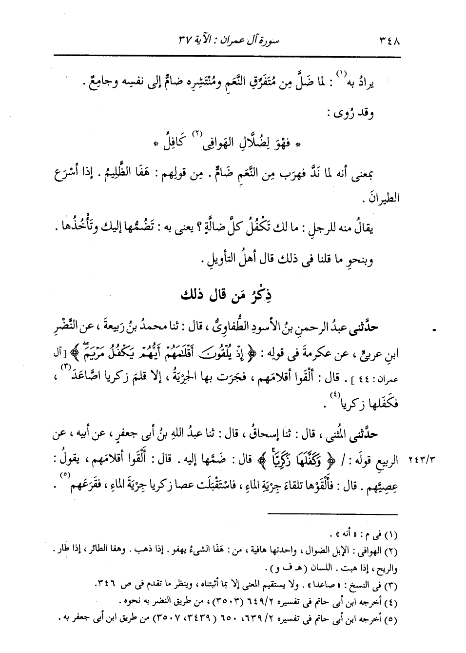 ذِكْرُ مَنْ قَالَ ذَلِكَ: حَدَّثَنِي عَبْدُ الرَّحْمَنِ بْنُ الْأَسْوَدِ الطُّفَاوِيُّ، قَالَ: ثنا مُحَمَّدُ بْنُ رَبِيعَةَ، عَنِ النَّضْرِ بْنِ عَرَبِيٍّ، عَنْ عِكْرِمَةَ، فِي قَوْلِهِ: {§إِذْ يُلْقُونَ أَقْلَامَهُمْ أَيُّهُمْ يَكْفُلُ مَرْيَمَ} [آل عمران: 44] قَالَ: «أَلْقَوْا أَقْلَامَهُمْ فَجَرَتْ بِهَا الْجِرْيَةُ إِلَّا قَلَمَ زَكَرِيَّا صَاعِدًا، فَكَفَلَهَا زَكَرِيَّا»