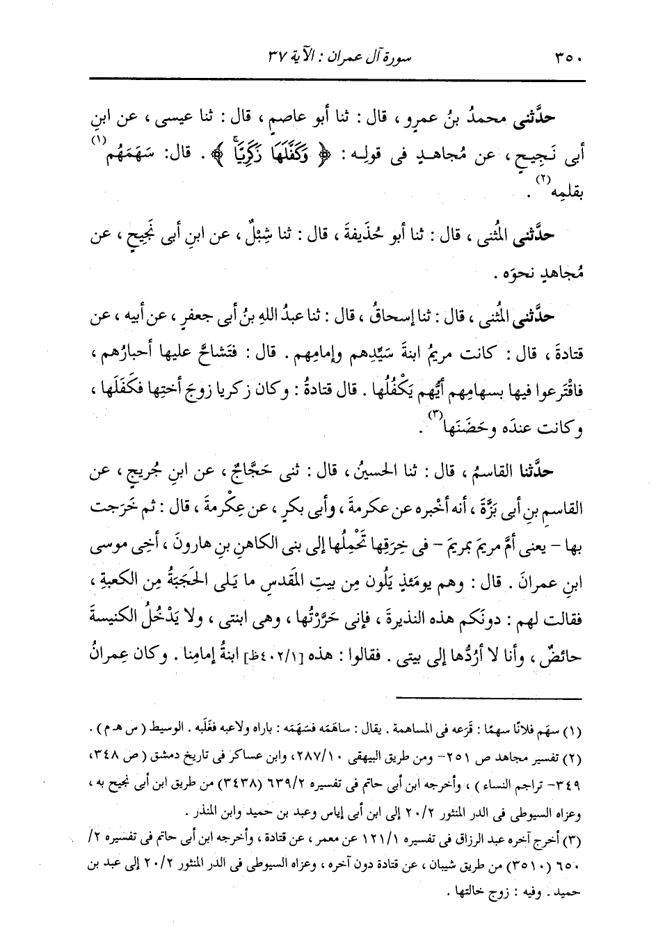 حَدَّثَنِي مُحَمَّدُ بْنُ عَمْرٍو، قَالَ: ثنا أَبُو عَاصِمٍ، قَالَ: ثنا عِيسَى، عَنِ ابْنِ أَبِي نَجِيحٍ، عَنْ مُجَاهِدٍ، فِي قَوْلِهِ: {§وَكَفَّلَهَا زَكَرِيَّا} [آل عمران: 37] قَالَ: «سَهَمَهُمْ بِقَلَمِهِ» حَدَّثَنِي الْمُثَنَّى، قَالَ: ثنا أَبُو حُذَيْفَةَ، قَالَ: ثنا شِبْلٌ، عَنِ ابْنِ أَبِي نَجِيحٍ، عَنْ مُجَاهِدٍ، نَحْوَهُ