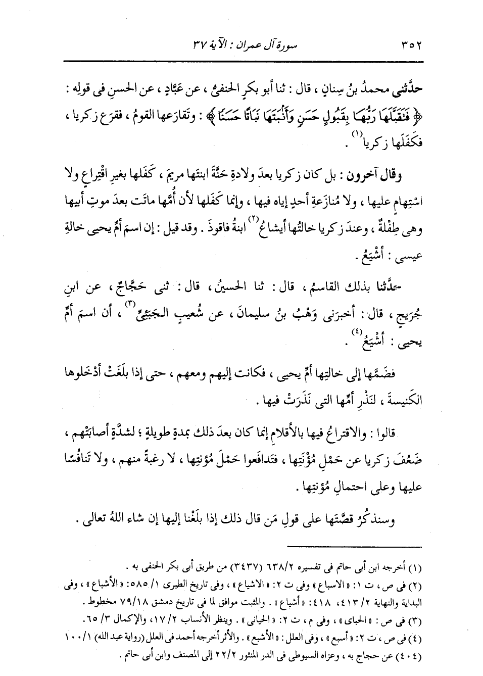 حَدَّثَنِي مُحَمَّدُ بْنُ سِنَانٍ، قَالَ: ثنا أَبُو بَكْرٍ الْحَنَفِيُّ، عَنْ عَبَّادٍ، عَنِ الْحَسَنِ، فِي قَوْلِهِ: {§فَتَقَبَّلَهَا رَبُّهَا بِقَبُولٍ حَسَنٍ وَأَنْبَتَهَا نَبَاتًا حَسَنًا} [آل عمران: 37] «وَتَقَارَعَهَا الْقَوْمُ، فَقَرَعَ زَكَرِيَّا، فَكَفَلَهَا زَكَرِيَّا» وَقَالَ آخَرُونَ: بَلْ كَانَ زَكَرِيَّا بَعْدَ وِلَادَةِ حَنَّةَ ابْنَتَهَا مَرْيَمَ كَفَلَهَا بِغَيْرِ اقْتِرَاعٍ وَلَا اسْتِهَامٍ عَلَيْهَا وَلَا مُنَازَعَةِ أَحَدٍ إِيَّاهُ فِيهَا، وَإِنَّمَا كَفَلَهَا لِأَنَّ أُمَّهَا مَاتَتْ بَعْدَ مَوْتِ أَبِيهَا وَهِيَ طِفْلَةٌ، وَعِنْدَ زَكَرِيَّا خَالَتُهَا إِيشَاعُ ابْنَةُ فَاقُوذَ؛ وَقَدْ قِيلَ: إِنَّ اسْمَ أُمِّ يَحْيَى خَالَةِ عِيسَى: أشيعُ