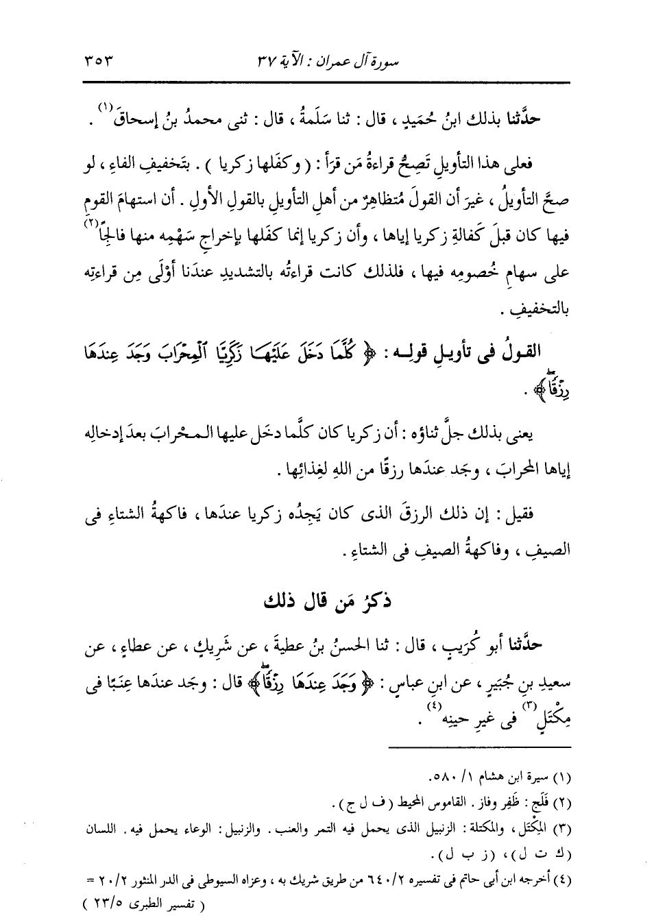 حَدَّثَنَا بِذَلِكَ ابْنُ حُمَيْدٍ، قَالَ: ثنا سَلَمَةُ، قَالَ: ثني مُحَمَّدُ بْنُ إِسْحَاقَ، فَعَلَى هَذَا التَّأْوِيلِ " §تَصِحُّ قِرَاءَةُ مَنْ قَرَأَ: (وَكَفَلَهَا زَكَرِيَّاءُ) بِتَخْفِيفِ الْفَاءِ لَوْ صَحَّ التَّأْوِيلُ، غَيْرَ أَنَّ الْقَوْلَ مُتَظَاهِرٌ مِنْ أَهْلِ التَّأْوِيلِ بِالْقَوْلِ الْأَوَّلِ أَنَّ اسْتِهَامَ الْقَوْمِ فِيهَا كَانَ قَبْلَ كَفَالَةِ زَكَرِيَّا إِيَّاهَا، وَأَنَّ زَكَرِيَّا إِنَّمَا كَفَلَهَا بِإِخْرَاجِ سَهْمِهِ مِنْهَا فَالِجًا عَلَى سِهَامِ خُصُومِهِ فِيهَا، فَلِذَلِكَ كَانَتْ قِرَاءَتُهُ بِالتَّشْدِيدِ عِنْدَنَا أَوْلَى مِنْ قِرَاءَتِهِ بِالتَّخْفِيفِ "