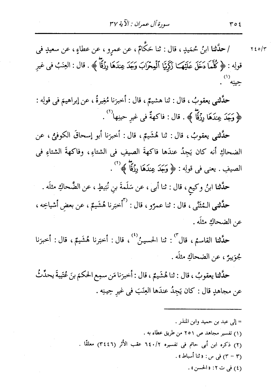 حَدَّثَنِي يَعْقُوبُ، قَالَ: ثنا هُشَيْمٌ، قَالَ: أَخْبَرَنَا أَبُو إِسْحَاقَ الْكُوفِيُّ، عَنِ الضَّحَّاكِ، «أَنَّهُ §كَانَ يَجِدُ عِنْدَهَا فَاكِهَةَ الصَّيْفِ فِي الشِّتَاءِ وَفَاكِهَةَ الشِّتَاءِ فِي الصَّيْفِ» ، يَعْنِي فِي قَوْلِهِ: {وَجَدَ عِنْدَهَا رِزْقًا} [آل عمران: 37] حَدَّثَنَا ابْنُ وَكِيعٍ، قَالَ: ثنا أَبِي، عَنْ سَلَمَةَ بْنِ نُبَيْطٍ، عَنِ الضَّحَّاكِ، مِثْلَهُ. حَدَّثَنِي الْمُثَنَّى، قَالَ: ثنا عَمْرٌو، قَالَ: أَخْبَرَنَا هُشَيْمٌ، عَنْ بَعْضِ أَشْيَاخِهِ، عَنِ الضَّحَّاكِ، مِثْلَهُ حَدَّثَنَا الْقَاسِمُ، قَالَ: ثنا الْحُسَيْنُ، قَالَ: أَخْبَرَنَا هُشَيْمٌ، قَالَ: أَخْبَرَنَا جُوَيْبِرٌ، عَنِ الضَّحَّاكِ، مِثْلَهُ