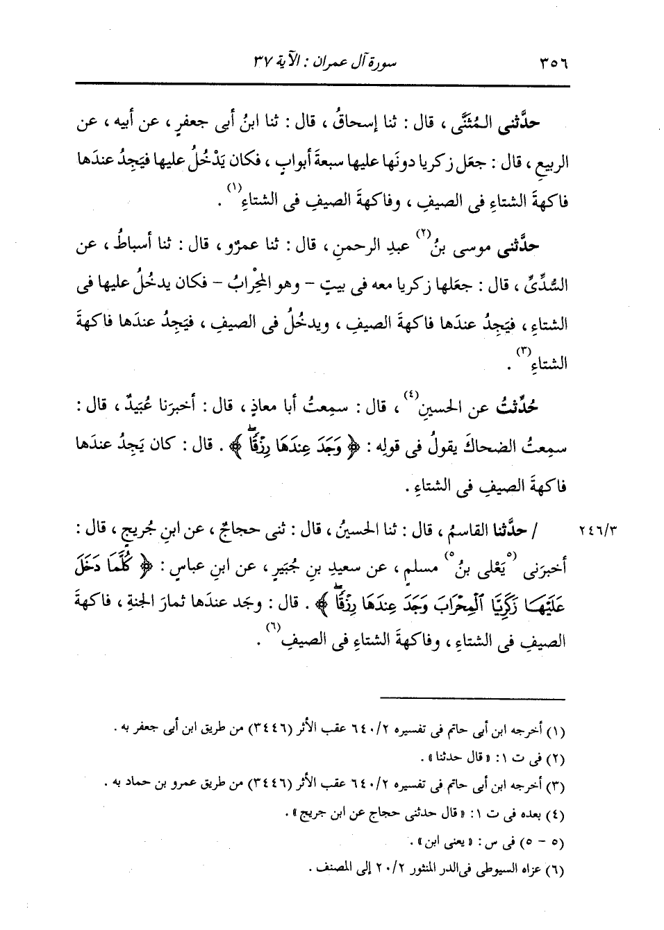 حَدَّثَنَا الْقَاسِمُ، قَالَ: ثنا الْحُسَيْنُ، قَالَ: ثني حَجَّاجٌ، عَنِ ابْنِ جُرَيْجٍ، قَالَ: أَخْبَرَنِي يَعْلَى بْنُ مُسْلِمٍ، عَنْ سَعِيدِ بْنِ جُبَيْرٍ، عَنِ ابْنِ عَبَّاسٍ، {§كُلَّمَا دَخَلَ عَلَيْهَا زَكَرِيَّا الْمِحْرَابَ وَجَدَ عِنْدَهَا رِزْقًا} [آل عمران: 37] قَالَ: «وَجَدَ عِنْدَهَا ثِمَارَ الْجَنَّةَ، فَاكِهَةَ الصَّيْفِ فِي الشِّتَاءِ وَفَاكِهَةَ الشِّتَاءِ فِي الصَّيْفِ»
