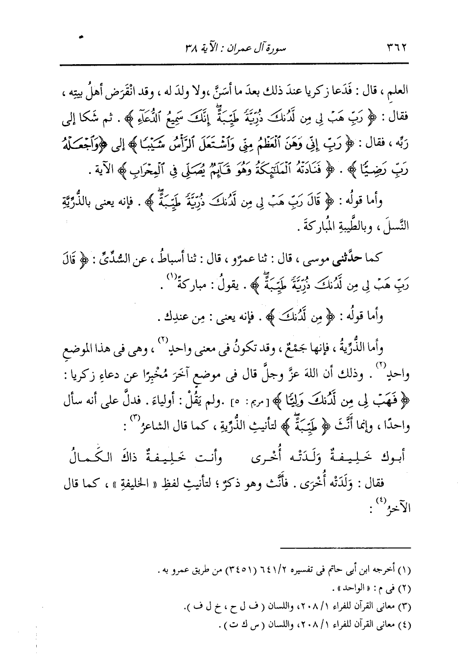 كَمَا: حَدَّثَنِي مُوسَى، قَالَ: ثنا عَمْرٌو، قَالَ: ثنا أَسْبَاطٌ، عَنِ السُّدِّيِّ: {قَالَ §رَبِّ هَبْ لِي مِنْ لَدُنْكَ ذُرِّيَّةً طَيِّبَةً} [آل عمران: 38] يَقُولُ: «مُبَارَكَةً» وَأَمَّا قَوْلُهُ: {مِنْ لَدُنْكَ} [آل عمران: 8] فَإِنَّهُ يَعْنِي مِنْ عِنْدِكَ. وَأَمَّا الذُّرِّيَّةُ: فَإِنَّهَا جَمْعٌ، وَقَدْ تَكُونِ فِي مَعْنَى الْوَاحِدِ، وَهِيَ فِي هَذَا الْمَوْضِعِ لِلْوَاحِدِ؛ وَذَلِكَ أَنَّ اللَّهَ عَزَّ وَجَلَّ قَالَ فِي مَوْضِعٍ آخَرَ مُخْبِرًا عَنْ دُعَاءِ زَكَرِيَّا: {فَهَبْ لِي مِنْ لَدُنْكَ وَلِيًّا} [مريم: 5] وَلَمْ يَقُلْ «أَوْلِيَاءَ» ، فَدَلَّ عَلَى أَنَّهُ سَأَلَ وَاحِدًا، وَإِنَّمَا أَنَّثَ طَيِّبَةً لِتَأْنِيثِ الذُّرِّيَّةِ، كَمَا قَالَ الشَّاعِرُ: