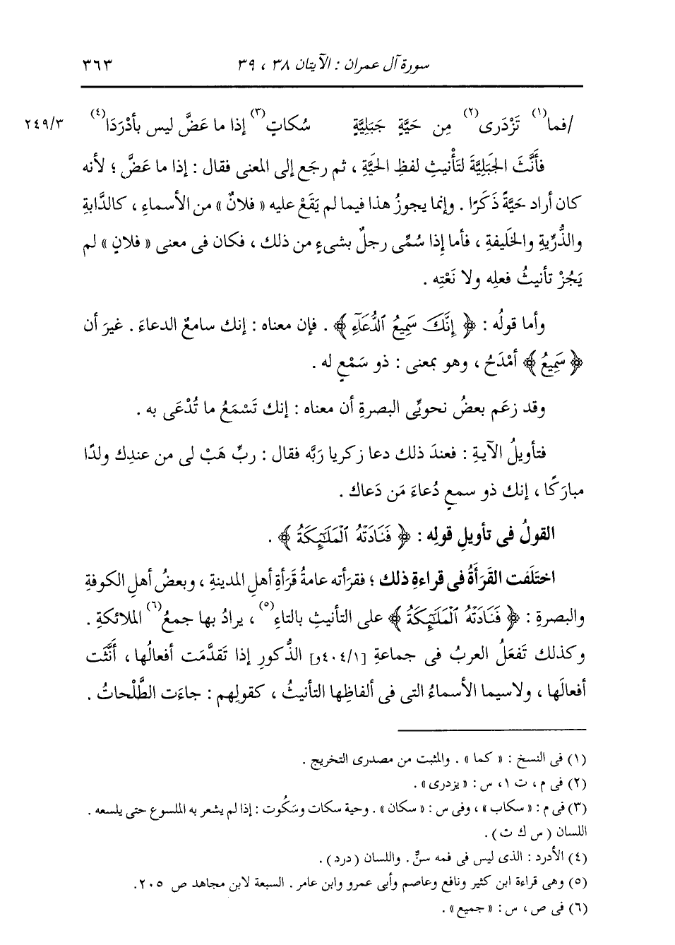 فَأَنَّثَ الْجَبَلِيَّةَ لِتَأْنِيثِ لَفْظِ الْحَيَّةِ، ثُمَّ رَجَعَ إِلَى الْمَعْنَى فَقَالَ: إِذَا مَا عَضَّ لِأَنَّهُ كَانَ أَرَادَ حَيَّةً ذَكَرًا، وَإِنَّمَا يَجُوزُ هَذَا فِيمَا لَمْ يَقَعْ عَلَيْهِ فُلَانٌ مِنَ الْأَسْمَاءِ كَالدَّابَّةِ وَالذُّرِّيَّةِ وَالْخَلِيفَةِ، فَأَمَّا إِذَا سُمِّيَ رَجُلٌ بِشَيْءٍ مِنْ ذَلِكَ، فَكَانَ فِي مَعْنَى فُلَانٍ لَمْ يَجُزْ تَأْنِيثُ فِعْلِهِ وَلَا نَعْتِهِ. وَأَمَّا قَوْلُهُ: {إِنَّكَ سَمِيعُ الدُّعَاءِ} [آل عمران: 38] فَإِنَّ مَعْنَاهُ أَنَّ سَامِعَ الدُّعَاءِ غَيْرَ أَنَّ سَمِيعًا أَمْدَحُ، وَهُوَ بِمَعْنَى ذُو سَمْعٍ لَهُ، وَقَدْ زَعَمَ بَعْضُ نَحْوِيِّي الْبَصْرَةِ أَنَّ مَعْنَاهُ أَنَّكَ تَسْمَعُ مَا تُدْعَى بِهِ، فَتَأْوِيلُ الْآيَةِ: فَعِنْدَ ذَلِكَ دَعَا زَكَرِيَّا رَبَّهُ فَقَالَ: رَبِّ هَبْ لِي مِنْ عِنْدِكَ وَلَدًا مُبَارَكًا، إِنَّكَ ذُو سَمْعٍ دُعَاءَ مَنْ دَعَاكَ