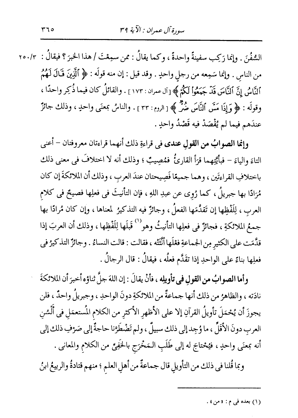 السُّفُنَ، وَإِنَّمَا رَكِبَ سَفِينَةً وَاحِدَةً، وَكَمَا يُقَالُ: مِمَّنْ سَمِعْتَ هَذَا الْخَبَرَ؟ فَيُقَالُ: مِنَ النَّاسِ، وَإِنَّمَا سَمِعَهُ مِنْ رَجُلٍ وَاحِدٍ؛ وَقَدْ قِيلَ: إِنَّ مِنْهُ قَوْلَهُ: {الَّذِينَ قَالَ لَهُمُ النَّاسُ إِنَّ النَّاسَ قَدْ جَمَعُوا لَكُمْ} [آل عمران: 173] وَالْقَائِلُ كَانَ فِيمَا ذُكِرَ وَاحِدًا، وَقَوْلُهُ: {وَإِذَا مَسَّ النَّاسَ ضُرٌّ} [الروم: 33] وَالنَّاسُ بِمَعْنَى وَاحِدٍ، وَذَلِكَ جَائِزٌ عِنْدَهُمْ فِيمَا لَمْ يُقْصَدْ فِيهِ قَصْدٌ وَاحِدٌ، وَإِنَّمَا الصَّوَابُ مِنَ الْقَوْلِ عِنْدِي فِي قِرَاءَةِ ذَلِكَ أَنَّهُمَا قِرَاءَتَانِ مَعْرُوفَتَانِ، أَعِنِّي التَّاءَ وَالْيَاءَ، فَبِأَيَّتِهِمَا قَرَأَ الْقَارِئُ فَمُصِيبٌ، وَذَلِكَ أَنَّهُ لَا اخْتِلَافَ فِي مَعْنَى ذَلِكَ بِاخْتِلَافِ الْقَرَائِنِ، وَهُمَا جَمِيعًا فَصِيحَتَانِ عِنْدَ الْعَرَبِ، وَذَلِكَ أَنَّ الْمَلَائِكَةَ إِنْ كَانَ مُرَادًا بِهَا جِبْرِيلُ كَمَا رُوِيَ عَنْ عَبْدِ اللَّهِ فَإِنَّ التَّأْنِيثَ فِي فِعْلِهَا فَصِيحٌ فِي كَلَامِ الْعَرَبِ لِلَفْظِهَا إِنْ تَقَدَّمَهَا الْفِعْلُ، وَجَائِزٌ فِيهِ التَّذْكِيرُ لِمَعْنَاهَا، وَإِنْ كَانَ مُرَادًا بِهَا جَمْعُ الْمَلَائِكَةِ فَجَائِزٌ فِي فِعْلِهَا التَّأْنِيثُ، وَهُوَ مِنْ قِبَلِهَا لِلَفْظِهَا، وَذَلِكَ أَنَّ الْعَرَبَ إِذَا قَدَّمَتْ عَلَى الْكَثِيرِ مِنَ الْجَمَاعَةِ فِعْلَهَا أَنَّثَتْهُ، فَقَالَتْ: قَالَتِ النِّسَاءُ، وَجَائِزٌ التَّذْكِيرُ فِي فِعْلِهَا بِنَاءً عَلَى الْوَاحِدِ إِذَا تَقَدَّمَ فِعْلُهُ، فَيُقَالُ: قَالَ الرِّجَالُ. وَأَمَّا الصَّوَابُ مِنَ الْقَوْلِ فِي تَأْوِيلِهِ، فَأَنْ يُقَالَ: إِنَّ اللَّهَ جَلَّ ثناؤُهُ أَخْبَرَ أَنَّ الْمَلَائِكَةَ نَادَتْهُ، وَالظَّاهِرُ مِنْ ذَلِكَ أَنَّهَا جَمَاعَةٌ مِنَ الْمَلَائِكَةِ دُونَ الْوَاحِدِ وَجِبْرِيلُ وَاحِدٌ فَلَنْ يَجُوزَ أَنْ يُحْمَلَ تَأْوِيلُ الْقُرْآنِ إِلَّا عَلَى الْأَظْهَرِ الْأَكْثَرِ مِنَ الْكَلَامِ الْمُسْتَعْمَلِ فِي أَلْسُنِ الْعَرَبِ، دُونَ الْأَقَلِّ مَا وُجِدَ إِلَى ذَلِكَ سَبِيلٌ، وَلَمْ يَضْطَرَّنَا حَاجَةٌ إِلَى صَرْفِ ذَلِكَ إِلَى أَنَّهُ بِمَعْنَى وَاحِدٍ، فَيَحْتَاجُ لَهُ إِلَى طَلَبِ الْمَخْرَجِ بِالْخَفِيِّ مِنَ الْكَلَامِ وَالْمَعَانِي. وَبِمَا قُلْنَا فِي ذَلِكَ مِنَ التَّأْوِيلِ قَالَ جَمَاعَةٌ مِنْ أَهْلِ الْعِلْمِ، مِنْهُمْ قَتَادَةُ، وَالرَّبِيعُ بْنُ
