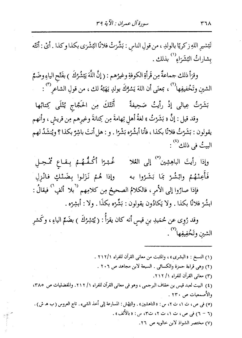 تَبْشِيرِ اللَّهِ زَكَرِيَّا بِالْوَلَدِ، مِنْ قَوْلِ النَّاسِ: بَشَّرْتُ فُلَانًا الْبُشْرَى بِكَذَا وَكَذَا، أَيْ أَتَتْهُ بِشَارَاتُ الْبُشْرَى بِذَلِكَ. وَقَرَأَ ذَلِكَ جَمَاعَةٌ مِنْ قُرَّاءِ الْكُوفَةِ وَغَيْرِهِمْ: (إِنَّ اللَّهَ يَبْشُرُكَ) بِفَتْحِ الْيَاءِ وَضَمِّ الشِّينِ وَتَخْفِيفِهَا، بِمَعْنَى: أَنَّ اللَّهَ يَسُرُّكَ بِوَلَدٍ يَهَبُهُ لَكَ، مِنْ قَوْلِ الشَّاعِرِ: