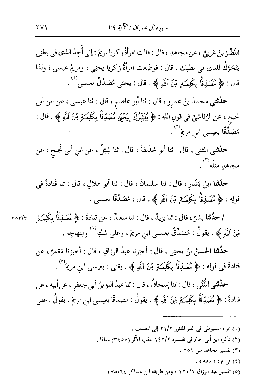 حَدَّثَنِي مُحَمَّدُ بْنُ عَمْرٍو، قَالَ: ثنا أَبُو عَاصِمٍ، قَالَ: ثنا عِيسَى، عَنِ ابْنِ أَبِي نَجِيحٍ، عَنِ الرَّقَاشِيِّ، فِي قَوْلِ اللَّهِ: {§يُبَشِّرُكَ بِيَحْيَى مُصَدِّقًا بِكَلِمَةٍ مِنَ اللَّهِ} [آل عمران: 39] قَالَ: «مُصَدِّقًا بِعِيسَى ابْنِ مَرْيَمَ» حَدَّثَنِي الْمُثَنَّى، قَالَ: ثنا أَبُو حُذَيْفَةَ، قَالَ: ثنا شِبْلٌ، عَنِ ابْنِ أَبِي نَجِيحٍ، عَنْ مُجَاهِدٍ، مِثْلَهُ
