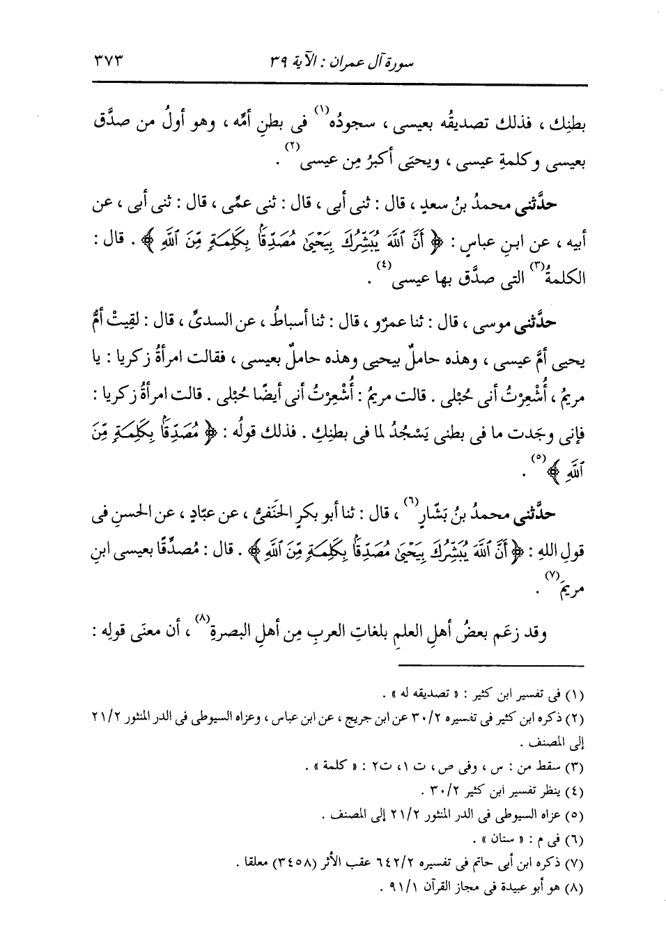 حَدَّثَنِي مُحَمَّدُ بْنُ سِنَانٍ، قَالَ: ثنا أَبُو بَكْرٍ الْحَنَفِيُّ، عَنْ عَبَّادٍ، عَنِ الْحَسَنِ، فِي قَوْلِ اللَّهِ {§أَنَّ اللَّهَ يُبَشِّرُكَ بِيَحْيَى مُصَدِّقًا بِكَلِمَةٍ مِنَ اللَّهِ} [آل عمران: 39] قَالَ: «مُصَدِّقًا بِعِيسَى ابْنِ مَرْيَمَ» وَقَدْ زَعَمَ بَعْضُ أَهْلِ الْعِلْمِ بِلُغَاتِ الْعَرَبِ مِنْ أَهْلِ الْبَصْرَةِ أَنَّ مَعْنَى قَوْلِهِ -[374]-: {مُصَدِّقًا بِكَلِمَةٍ مِنَ اللَّهِ} [آل عمران: 39] بِكِتَابٍ مِنَ اللَّهِ، مِنْ قَوْلِ الْعَرَبِ: أَنْشَدَنِي فُلَانٌ كَلِمَةَ كَذَا، يُرَادُ بِهِ قَصِيدَةُ كَذَا، جَهْلًا مِنْهُ بِتَأْوِيلِ الْكَلِمَةِ، وَاجْتِرَاءً عَلَى تَرْجَمَةِ الْقُرْآنِ بِرَأْيهِ