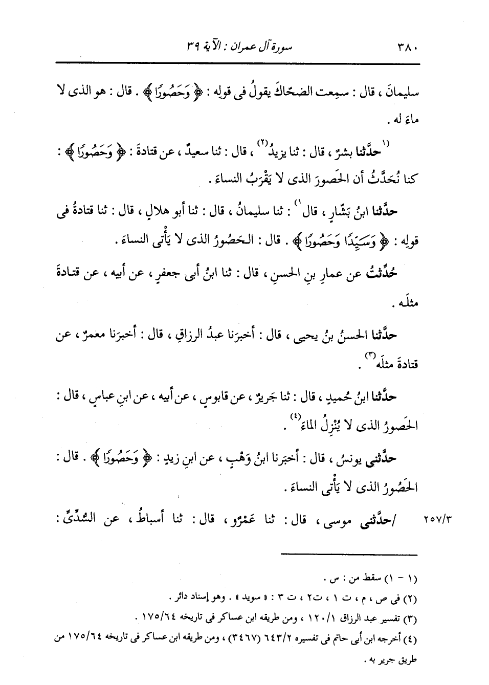 حَدَّثَنَا ابْنُ بَشَّارٍ، قَالَ: ثنا سُلَيْمَانُ، قَالَ: ثنا أَبُو هِلَالٍ، قَالَ: ثنا قَتَادَةُ فِي قَوْلِهِ: {§وَسَيِّدًا وَحَصُورًا} [آل عمران: 39] قَالَ: " الْحَصُورُ: الَّذِي لَا يَأْتِي النِّسَاءَ " حُدِّثْتُ عَنْ عَمَّارِ بْنِ الْحَسَنِ، قَالَ: ثنا ابْنُ أَبِي جَعْفَرٍ، عَنْ أَبِيهِ، عَنْ قَتَادَةَ، مِثْلَهُ. حَدَّثَنَا الْحَسَنُ بْنُ يَحْيَى، قَالَ: أَخْبَرَنَا عَبْدُ الرَّزَّاقِ، قَالَ: أَخْبَرَنَا مَعْمَرٌ، عَنْ قَتَادَةَ، مِثْلَهُ