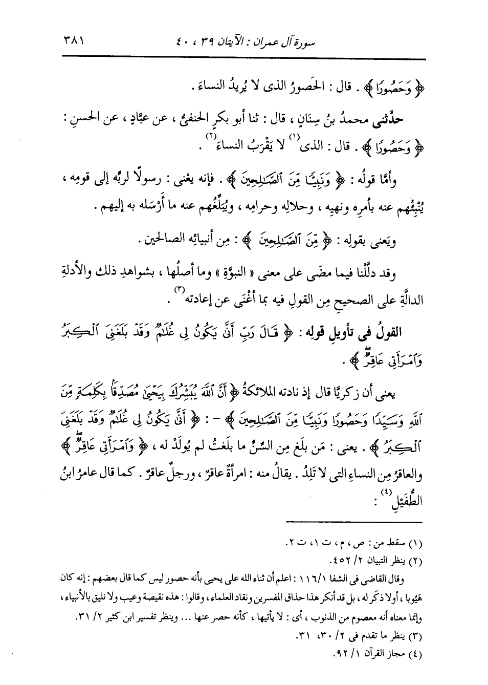 حَدَّثَنِي مُحَمَّدُ بْنُ سِنَانٍ، قَالَ: ثنا أَبُو بَكْرٍ الْحَنَفِيُّ، عَنْ عَبَّادٍ، عَنِ الْحَسَنِ: {§وَحَصُورًا} [آل عمران: 39] قَالَ: «لَا يَقْرَبُ النِّسَاءَ» وَأَمَّا قَوْلُهُ: {وَنَبِيًّا مِنَ الصَّالِحِينَ} [آل عمران: 39] فَإِنَّهُ يَعْنِي: رَسُولًا لِرَبِّهِ إِلَى قَوْمِهِ، يُنْبِئُهُمْ عَنْهُ بِأَمْرِهِ وَنَهْيِهِ، وَحَلَالِهِ وَحَرَامِهِ، وَيُبَلِّغُهُمْ عَنْهُ مَا أَرْسَلَهُ بِهِ إِلَيْهِمْ. وَيَعْنِي بِقَوْلِهِ: {مِنَ الصَّالِحِينَ} [آل عمران: 46] مِنْ أَنْبِيَائِهِ الصَّالِحِينَ. وَقَدْ دَلَّلْنَا فِيمَا مَضَى عَلَى مَعْنَى النُّبُوَّةِ وَمَا أَصْلُهَا بِشَوَاهِدِ ذَلِكَ وَالْأَدِلَّةِ الدَّالَّةِ عَلَى الصَّحِيحِ مِنَ الْقَوْلِ فِيهِ بِمَا أَغْنَى عَنْ إِعَادَتِهِ