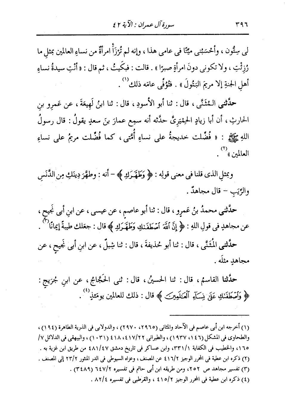 حَدَّثَنِي مُحَمَّدُ بْنُ عَمْرٍو، قَالَ: ثنا أَبُو عَاصِمٍ، عَنْ عِيسَى، عَنِ ابْنِ أَبِي نَجِيحٍ، عَنْ مُجَاهِدٍ، فِي قَوْلِ اللَّهِ: {§إِنَّ اللَّهَ اصْطَفَاكِ وَطَهَّرَكِ} [آل عمران: 42] قَالَ: «جَعَلَكِ طَيِّبَةً إِيمَانًا» حَدَّثَنِي الْمُثَنَّى، قَالَ: ثنا أَبُو حُذَيْفَةَ، قَالَ: ثنا شِبْلٌ، عَنِ ابْنِ أَبِي نَجِيحٍ، عَنْ مُجَاهِدٍ، مِثْلَهُ