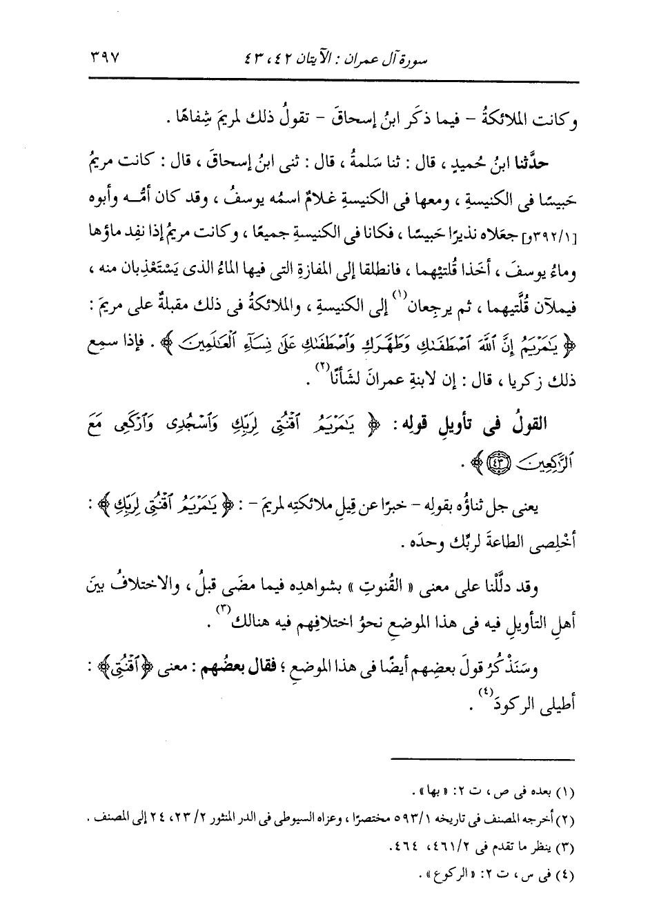 §الْقَوْلُ فِي تَأْوِيلِ قَوْلِهِ تَعَالَى: {يَا مَرْيَمُ اقْنُتِي لِرَبِّكِ وَاسْجُدِي وَارْكَعِي مَعَ الرَّاكِعِينَ} [آل عمران: 43] يَعْنِي جَلَّ ثناؤُهُ بِقَوْلِهِ خَبَرًا عَنْ قِيلِ مَلَائِكَتِهِ لِمَرْيَمَ: {يَا مَرْيَمُ اقْنُتِي لِرَبِّكِ} [آل عمران: 43] أَخْلِصِي الطَّاعَةَ لِرَبِّكِ وَحْدَهُ وَقَدْ دَلَّلْنَا عَلَى مَعْنَى الْقُنُوتِ بِشَوَاهِدِهِ فِيمَا مَضَى قَبْلُ. وَاخْتِلَافٌ بَيْنَ أَهْلُ التَّأْوِيلِ فِيهِ فِي هَذَا الْمَوْضِعِ نَحْوَ اخْتِلَافِهِمْ فِيهِ هُنَالِكَ، وَسَنَذْكُرُ قَوْلَ بَعْضِهِمْ أَيْضًا فِي هَذَا الْمَوْضِعِ، فَقَالَ بَعْضُهُمْ: مَعْنَى «اقْنُتِي» : أَطِيلِي الرُّكُودَ