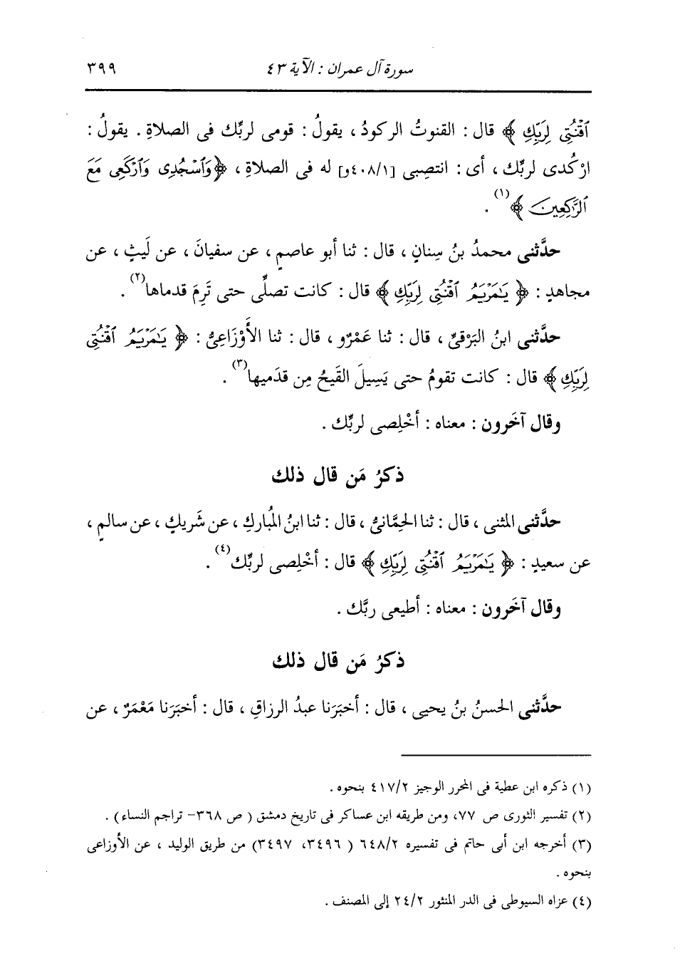 ذِكْرُ مَنْ قَالَ ذَلِكَ: حَدَّثَنِي الْحَسَنُ بْنُ يَحْيَى، قَالَ: أَخْبَرَنَا عَبْدُ الرَّزَّاقِ، قَالَ: أَخْبَرَنَا مَعْمَرٌ، عَنْ -[400]- قَتَادَةَ، فِي قَوْلِهِ: {§اقْنُتِي لِرَبِّكِ} [آل عمران: 43] قَالَ: «أَطِيعِي رَبَّكِ»