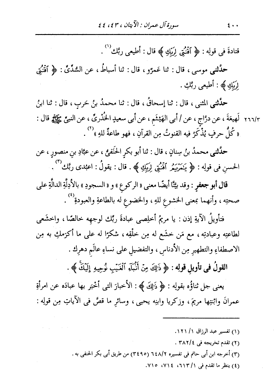حَدَّثَنِي مُحَمَّدُ بْنُ سِنَانٍ، قَالَ: ثنا أَبُو بَكْرٍ الْحَنَفِيُّ، عَنْ عَبَّادِ بْنِ مَنْصُورٍ، عَنِ الْحَسَنِ، فِي قَوْلِهِ: {§يَا مَرْيَمُ اقْنُتِي لِرَبِّكِ} [آل عمران: 43] قَالَ: يَقُولُ: «أعَبْدي رَبَّكِ» قَالَ أَبُو جَعْفَرٍ: وَقَدْ بَيَّنَّا أَيْضًا مَعْنَى الرُّكُوعِ وَالسُّجُودِ بِالْأَدِلَّةِ الدَّالَّةِ عَلَى صِحَّتِهِ، وَأَنَّهُمَا بِمَعْنَى الْخُشُوعِ لِلَّهِ وَالْخُضُوعِ لَهُ بِالطَّاعَةِ وَالْعُبُودِيَّةِ. فَتَأْوِيلُ الْآيَةِ إِذًا: يَا مَرْيَمُ أَخْلِصِي عُبَادَةَ رَبِّكِ لِوَجْهِهِ خَالِصًا، وَاخْشَعِي لِطَاعَتِهِ وَعِبَادَتِهِ، مَعَ مَنْ خَشَعَ لَهُ مِنْ خَلْقِهِ، شُكْرًا لَهُ عَلَى مَا أَكْرَمَكِ بِهِ مِنَ الِاصْطِفَاءِ وَالتَّطْهِيرِ مِنَ الْأَدْنَاسِ وَالتَّفْضِيلِ عَلَى نِسَاءِ عَالَمِ دَهْرِكِ