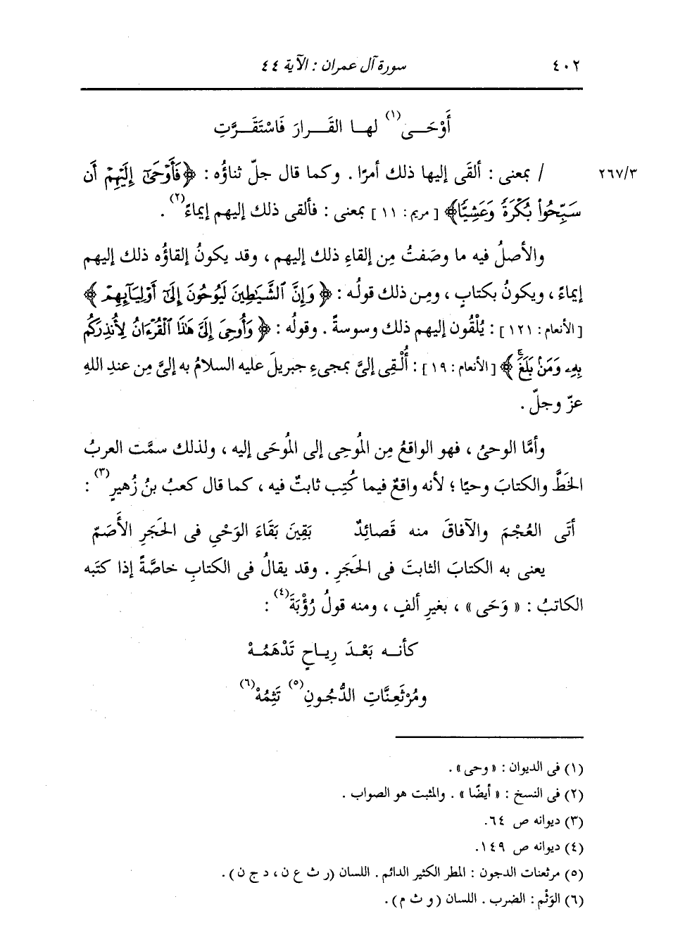 بِمَعْنَى: أَلْقَى إِلَيْهَا ذَلِكَ أَمْرًا، وَكَمَا قَالَ جَلَّ ثناؤُهُ: {فَأَوْحَى إِلَيْهِمْ أَنْ سَبِّحُوا بُكْرَةً وَعَشِيًّا} [مريم: 11] بِمَعْنَى: فَأَلْقَى ذَلِكَ إِلَيْهِمْ أَيْضًا، وَالْأَصْلُ فِيهِ مَا وَصَفْتُ مِنْ إِلْقَاءِ ذَلِكَ إِلَيْهِمْ، وَقَدْ يَكُونُ إِلْقَاؤُهُ ذَلِكَ إِلَيْهِمْ إِيمَاءً، وَيَكُونُ بِكِتَابٍ، وَمِنْ ذَلِكَ قَوْلُهُ: {وَإِنَّ الشَّيَاطِينَ لَيُوحُونَ إِلَى أَوْلِيَائِهِمْ} [الأنعام: 121] يُلْقُونَ إِلَيْهِمْ ذَلِكَ وَسْوَسَةً، وَقَوْلُهُ: {وَأُوحِيَ إِلَيَّ هَذَا الْقُرْآنُ لِأُنْذِرَكُمْ بِهِ وَمَنْ بَلَغَ} [الأنعام: 19] أُلْقِيَ إِلَيَّ بِمَجِيءِ جِبْرِيلَ عَلَيْهِ السَّلَامُ بِهِ إِلَيَّ مِنْ عِنْدِ اللَّهِ عَزَّ وَجَلَّ، وَأَمَّا الْوَحْيُ: فَهُوَ الْوَاقِعُ مِنَ الْمُوحِي إِلَى الْمُوحَى إِلَيْهِ، وَلِذَلِكَ سَمَّتِ الْعَرَبُ الْخَطَّ وَالْكِتَابَ وَحْيًا، لِأَنَّهُ وَاقِعٌ فِيمَا كُتِبَ ثَابِتٌ فِيهِ، كَمَا قَالَ كَعْبُ بْنُ زُهَيْرٍ: