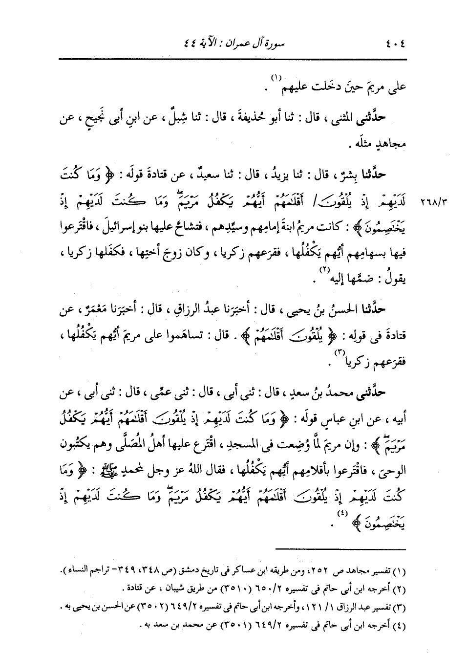 حَدَّثَنِي مُحَمَّدُ بْنُ سَعْدٍ، قَالَ: ثني أَبِي، قَالَ: ثني عَمِّي، قَالَ: ثني أَبِي، عَنْ أَبِيهِ، عَنِ ابْنِ عَبَّاسٍ، قَوْلُهُ: {§وَمَا كُنْتَ لَدَيْهِمْ إِذْ يُلْقُونَ أَقْلَامَهُمْ أَيُّهُمْ يَكْفُلُ مَرْيَمَ} [آل عمران: 44] «وَإِنَّ مَرْيَمَ لَمَّا وُضِعَتْ فِي الْمَسْجِدِ، اقَتَرَعَ عَلَيْهَا أَهْلُ الْمُصَلَّى، وَهُمْ يَكْتُبُونَ الْوَحْيَ، فَاقْتَرَعُوا بِأَقْلَامِهِمْ أَيُّهُمْ يَكْفُلُهَا، فَقَالَ اللَّهُ عَزَّ وَجَلَّ لِمُحَمَّدٍ صَلَّى اللهُ عَلَيْهِ وَسَلَّمَ» : {وَمَا كُنْتَ لَدَيْهِمْ إِذْ يُلْقُونَ أَقْلَامَهُمْ أَيُّهُمْ يَكْفُلُ مَرْيَمَ وَمَا كُنْتَ لَدَيْهِمْ إِذْ يَخْتَصِمُونَ} [آل عمران: 44]