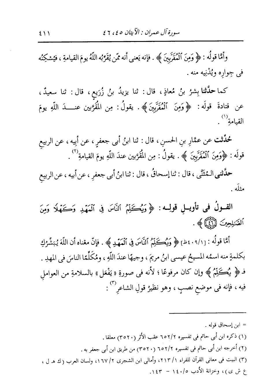 §الْقَوْلُ فِي تَأْوِيلِ قَوْلِهِ تَعَالَى: {وَيُكَلِّمُ النَّاسَ فِي الْمَهْدِ وَكَهْلًا وَمِنَ الصَّالِحِينَ} [آل عمران: 46] أَمَّا قَوْلُهُ: {وَيُكَلِّمُ النَّاسَ فِي الْمَهْدِ} [آل عمران: 46] فَإِنَّ مَعْنَاهُ: أَنَّ اللَّهَ يُبَشِّرُكِ بِكَلِمَةٍ مِنْهُ اسْمُهُ الْمَسِيحُ عِيسَى ابْنُ مَرْيَمَ، وَجِيهًا عِنْدَ اللَّهِ، وُمَكَلِّمًا النَّاسَ فِي الْمَهْدِ، فَ «يُكَلِّمُ» وَإِنْ كَانَ مَرْفُوعًا، لِأَنَّهُ فِي صُورَةِ «يُفَعِّلُ» بِالسَّلَامَةِ مِنَ الْعَوَامِلِ فِيهِ، فَإِنَّهُ فِي مَوْضِعِ نَصْبٍ، وَهُوَ نَظِيرُ قَوْلِ الشَّاعِرِ: