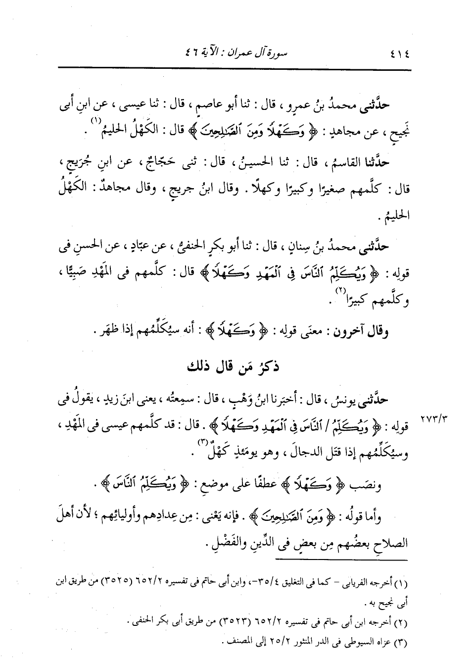 ذِكْرُ مَنْ قَالَ ذَلِكَ: حَدَّثَنِي يُونُسُ، قَالَ: أَخْبَرَنَا ابْنُ وَهْبٍ، قَالَ: سَمِعْتُهُ يَعْنِي ابْنَ زَيْدٍ يَقُولُ فِي قَوْلِهِ: {§وَيُكَلِّمُ النَّاسَ فِي الْمَهْدِ وَكَهْلًا} [آل عمران: 46] قَالَ: «قَدْ كَلَّمَهُمْ عِيسَى فِي الْمَهْدِ، وَسَيُكَلِّمُهُمْ إِذَا قَتَلَ الدَّجَّالَ، وَهُوَ يَوْمَئِذٍ كَهْلٌ» وَنَصَبَ كَهْلًا عَطَفَا عَلَى مَوْضِعِ: وَيُكَلِّمُ النَّاسَ، وَأَمَّا قَوْلِهِ: {وَمِنَ الصَّالِحِينَ} [آل عمران: 46] فَإِنَّهُ يَعْنِي: مِنْ عِدَادِهِمْ وَأَوْلِيَائِهِمْ لِأَنَّ أَهْلَ الصَّلَاحِ بَعْضُهُمْ مِنْ بَعْضٍ فِي الدِّينِ وَالْفَضْلِ