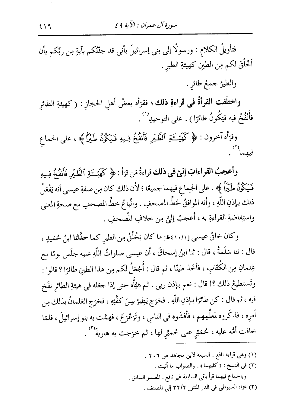 فَتَأْوِيلُ الْكَلَامِ: وَرَسُولًا إِلَى بَنِي إِسْرَائِيلَ بِأَنِّي قَدْ جِئْتُكُمْ بِآيَةٍ مِنْ رَبِّكُمْ بِأَنْ أُخْلَقَ لَكُمْ مِنَ الطِّينِ كَهَيْئَةِ الطَّيْرِ، وَالطَّيْرُ جَمْعُ طَائِرٍ. وَاخْتَلَفَتِ الْقُرَّاءُ فِي قِرَاءَةِ ذَلِكَ، فَقَرَأَهُ بَعْضُ أَهْلِ الْحِجَازِ: (كَهَيْئَةِ الطَّائِرِ فَأَنْفُخُ فِيهِ فَيَكُونُ طَائِرًا) ، عَلَى التَّوْحِيدِ، وَقَرَأَهُ آخَرُونَ: {كَهَيْئَةِ الطَّيْرِ فَأَنْفُخُ فِيهِ فَيَكُونُ طَيْرًا} [آل عمران: 49] عَلَى الْجِمَاعِ كِلَيْهِمَا. وَأَعْجَبُ الْقِرَاءَاتِ إِلَيَّ فِي ذَلِكَ قِرَاءَةُ مَنْ قَرَأَ: {كَهَيْئَةِ الطَّيْرِ فَأَنْفُخُ فِيهِ فَيَكُونُ طَيْرًا} [آل عمران: 49] عَلَى الْجِمَاعِ فِيهِمَا جَمِيعًا؛ لِأَنَّ ذَلِكَ كَانَ مِنْ صِفَةِ عِيسَى أَنَّهُ يَفْعَلُ ذَلِكَ بِإِذْنِ اللَّهِ، وَأَنَّهُ مُوَافِقٌ لِخَطِّ الْمُصْحَفِ، وَاتِّبَاعُ خَطِّ الْمُصْحَفِ مَعَ صِحَّةِ الْمَعْنَى وَاسْتِفَاضَةِ الْقِرَاءَةِ بِهِ أَعْجَبُ إِلَيَّ مِنْ خِلَافِ الْمُصْحَفِ. وَكَانَ خَلْقُ عِيسَى: مَا كَانَ يَخْلُقُ مِنَ الطَّيْرِ