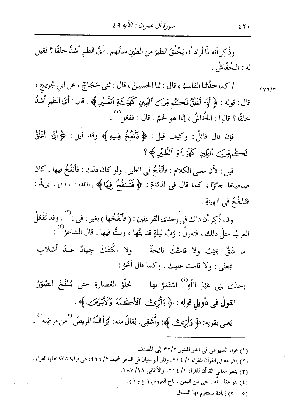 كَمَا: حَدَّثَنَا الْقَاسِمُ، قَالَ: ثنا الْحُسَيْنُ، قَالَ: ثني حَجَّاجٌ، عَنِ ابْنِ جُرَيْجٍ، قَالَ: قَوْلُهُ: {§أَنِّي أَخْلِقُ لَكُمْ مِنَ الطِّينِ كَهَيْئَةِ الطَّيْرِ} [آل عمران: 49] قَالَ: «أَيُّ الطَّيْرِ أَشَدُّ خَلْقًا» ؟ قَالُوا: الْخُفَّاشُ إِنَّمَا هُوَ لَحْمٌ، قَالَ فَفَعَلَ " فَإِنْ قَالَ قَائِلٌ: وَكَيْفَ قِيلَ: {فَأَنْفُخُ فِيهِ} [آل عمران: 49] وَقَدْ قِيلَ: {أَنِّي أُخْلَقُ لَكُمْ مِنَ الطِّينِ كَهَيْئَةِ الطَّيْرِ} [آل عمران: 49] ؟ قِيلَ: لِأَنَّ مَعْنَى الْكَلَامِ: فَأَنْفُخُ فِي الطَّيْرِ، وَلَوْ كَانَ ذَلِكَ: فَأَنْفُخُ فِيهَا، كَانَ صَحِيحًا جَائِزًا، كَمَا قَالَ فِي الْمَائِدَةِ: {فَأَنْفُخُ فِيهِ} [آل عمران: 49] يُرِيدُ: فَأَنْفُخُ فِي الْهَيْئَةِ، وَقَدْ ذُكِرَ أَنَّ ذَلِكَ فِي إِحْدَى الْقِرَاءَتَيْنِ: «فَأَنْفُخُهَا» بِغَيْرِ «فِي» ، وَقَدْ تَفْعَلُ الْعَرَبُ مِثْلَ ذَلِكَ فَتَقُولُ: رُبَّ لَيْلَةٍ قَدْ بَتُّهَا وَبِتُّ فِيهَا، قَالَ الشَّاعِرُ: