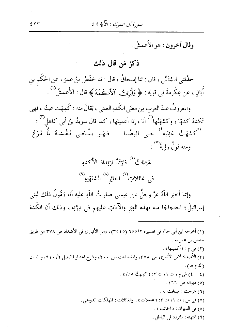 ذِكْرُ مَنْ قَالَ ذَلِكَ: حَدَّثَنِي الْمُثَنَّى، قَالَ: ثنا إِسْحَاقُ، قَالَ: ثنا حَفْصُ بْنُ عُمَرَ، عَنِ الْحَكَمِ بْنِ أَبَانَ، عَنْ عِكْرِمَةَ، فِي قَوْلِهِ: {§وَأُبْرِئُ الْأَكْمَهَ} [آل عمران: 49] قَالَ: «الْأَعْمَشُ» وَالْمَعْرُوفُ عِنْدَ الْعَرَبِ مِنْ مَعْنَى الْكَمَهِ: الْعَمَى، يُقَالُ مِنْهُ: كَمِهَتْ عَيْنُهُ، فَهِيَ تَكْمَهُ كَمَهًا، وَأَكْمَهْتُهَا أَنَا: إِذَا أَعْمَيْتُهَا كَمَا قَالَ سُوَيْدُ بْنُ أَبِي كَاهِلٍ: