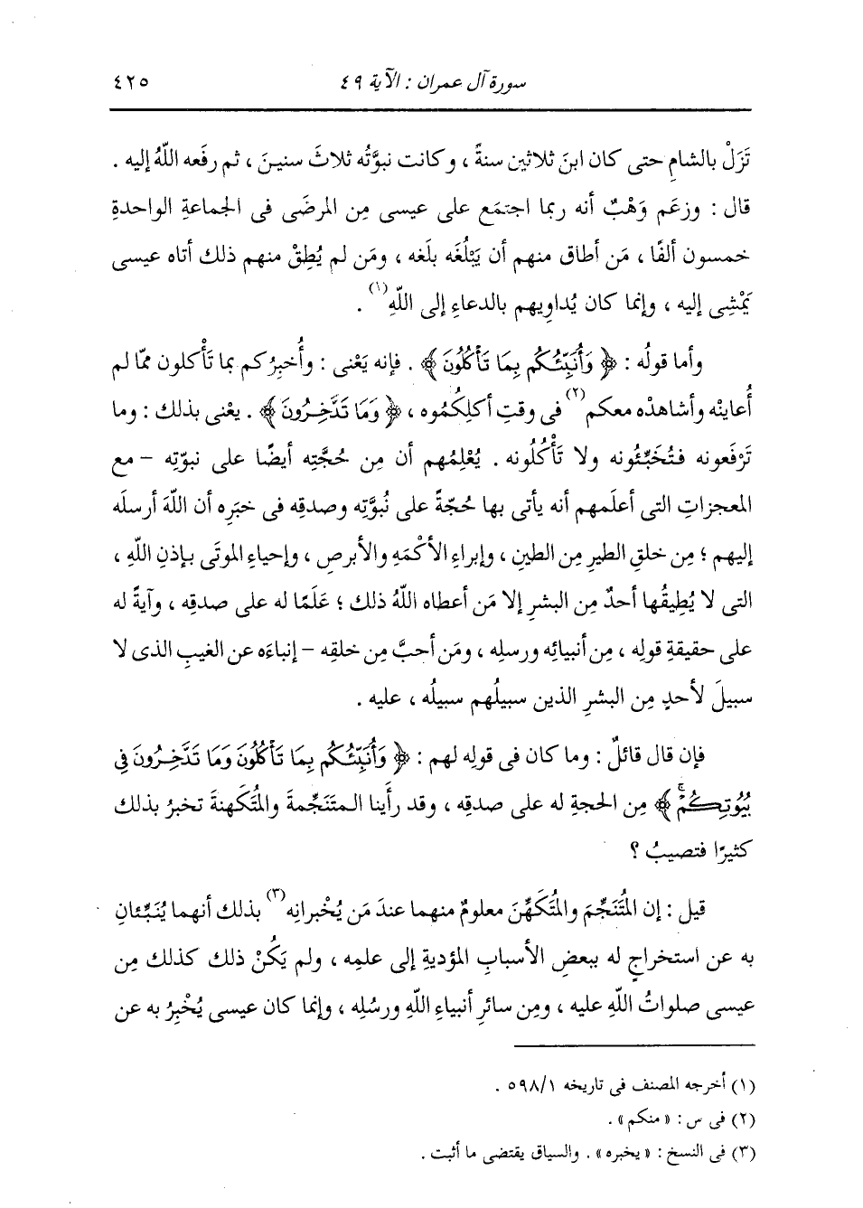 تَزَلْ بِالشَّامِ حَتَّى كَانَ ابْنَ ثَلَاثِينَ سَنَةً، وَكَانَتْ نُبُوَّتُهُ ثَلَاثَ سِنِينَ، ثُمَّ رَفَعَهُ اللَّهُ إِلَيْهِ» قَالَ: وَزَعَمَ وَهْبٌ أَنَّهُ رُبَّمَا اجْتَمَعَ عَلَى عِيسَى مِنَ الْمَرْضَى فِي الْجَمَاعَةِ الْوَاحِدَةِ خَمْسُونَ أَلْفًا، مَنْ أَطَاقَ مِنْهُمْ أَنْ يَبْلُغَهُ بَلَغَهُ، وَمَنْ لَمْ يُطِقْ مِنْهُمْ ذَلِكَ أَتَاهُ عِيسَى يَمْشِي إِلَيْهِ، وَإِنَّمَا كَانَ يُدَاوِيهِمْ بِالدُّعَاءِ إِلَى اللَّهِ. وَأَمَّا قَوْلُهُ: {وَأُنَبِّئُكُمْ بِمَا تَأْكُلُونَ} [آل عمران: 49] فَإِنَّهُ يَعْنِي: وَأُخْبِرُكُمْ بِمَا تَأْكُلُونَهُ مِمَّا لَمْ أُعَايِنْهُ وَأُشَاهِدْهُ مَعَكُمْ فِي وَقْتِ أَكْلِكُمُوهُ {وَمَا تَدَّخِرُونَ} [آل عمران: 49] يَعْنِي بِذَلِكَ: وَمَا تَرْفَعُونَهُ فَتُخَبِّئُونَهُ وَلَا تَأْكُلُونَهُ، يُعْلِمُهُمْ أَنَّ مِنْ حُجَّتِهِ أَيْضًا عَلَى نُبُوَّتِهِ مَعَ الْمُعْجِزَاتِ الَّتِي أَعْلَمُهُمْ أَنَّهُ يَأْتِي بِهَا حُجَّةً عَلَى نُبُوَّتِهِ وَصِدْقِهِ فِي خَبَرِهِ أَنَّ اللَّهَ أَرْسَلَهُ إِلَيْهِمْ: مِنْ خَلْقِ الطَّيْرِ مِنَ الطِّينِ، وَإِبْرَاءِ الْأَكْمَهِ وَالْأَبْرَصِ، وَإِحْيَاءِ الْمَوْتَى بِإِذْنِ اللَّهِ، الَّتِي لَا يُطِيقُهَا أَحَدٌ مِنَ الْبَشَرِ، إِلَّا مَنْ أَعْطَاهُ اللَّهُ ذَلِكَ، عِلْمًا لَهُ عَلَى صِدْقِهِ، وَآيَةً لَهُ عَلَى حَقِيقَةِ قَوْلِهِ مِنْ أَنْبِيَائِهِ وَرُسُلِهِ، وَمَنْ أَحَبَّ مِنْ خَلْقِهِ إِنْبَاءَهُ عَنِ الْغَيْبِ الَّذِي لَا سَبِيلَ لِأَحَدٍ مِنَ الْبَشَرِ الَّذِينَ سَبِيلَهُمْ سَبِيلُهُ عَلَيْهِ. فَإِنْ قَالَ قَائِلٌ: وَمَا كَانَ فِي قَوْلِهِ لَهُمْ: {وَأُنَبِّئُكُمْ بِمَا تَأْكُلُونَ وَمَا تَدَّخِرُونَ فِي بُيُوتِكُمْ} [آل عمران: 49] مِنَ الْحُجَّةِ لَهُ عَلَى صِدْقِهِ، وَقَدْ رَأَيْنَا الْمُتَنَجِّمَةَ وَالْمُتَكَهِّنَةَ تُخْبِرُ بِذَلِكَ كَثِيرًا فَتُصِيبُ؟ قِيلَ: إِنَّ الْمُتَنَجِّمَ وَالْمُتَكَهِّنَ مَعْلُومٌ مِنْهُمَا عِنْدَ مَنْ يُخْبِرُهُ بِذَلِكَ أَنَّهُمَا يُنْبِئَانِ بِهِ عَنِ اسْتِخْرَاجٍ لَهُ بِبَعْضِ الْأَسْبَابِ الْمُؤَدِيَةِ إِلَى عِلْمِهِ، وَلَمْ يَكُنْ ذَلِكَ كَذَلِكَ مِنْ عِيسَى صَلَوَاتُ اللَّهِ عَلَيْهِ وَمِنْ سَائِرِ أَنْبِيَاءِ اللَّهِ وَرُسُلِهِ، وَإِنَّمَا كَانَ عِيسَى يُخْبِرُ بِهِ عَنْ