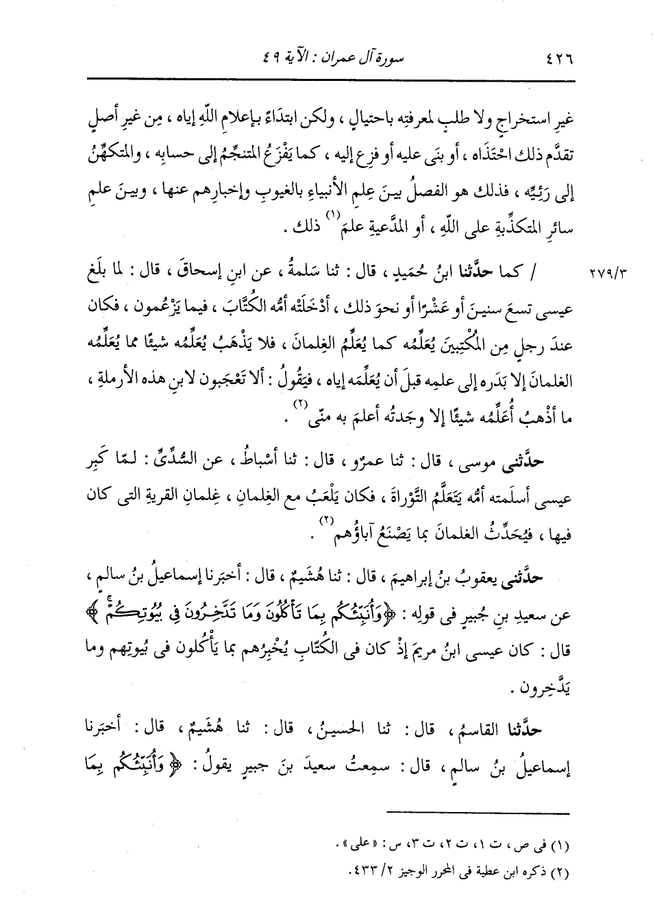 حَدَّثَنَا الْقَاسِمُ، قَالَ: ثنا الْحُسَيْنُ، قَالَ: ثنا هُشَيْمٌ، قَالَ: أَخْبَرَنَا إِسْمَاعِيلُ بْنُ سَالِمٍ، قَالَ: سَمِعْتُ سَعِيدَ بْنَ جُبَيْرٍ يَقُولُ: {§وَأُنَبِّئُكُمْ بِمَا -[427]- تَأْكُلُونَ وَمَا تَدَّخِرُونَ فِي بُيُوتِكُمْ} [آل عمران: 49] قَالَ: " إِنَّ عِيسَى ابْنَ مَرْيَمَ كَانَ يَقُولُ لِلْغُلَامِ فِي الْكُتَّابِ: يَا فُلَانُ، إِنَّ أَهْلَكَ قَدْ خَبَّئُوا لَكَ كَذَا وَكَذَا مِنَ الطَّعَامِ فَتُطْعِمُنِي مِنْهُ؟ " فَهَكَذَا فِعْلُ الْأَنْبِيَاءِ وَحُجَجُهَا إِنَّمَا تَأْتِي بِمَا أَتَتْ بِهِ مِنَ الْحَجِيجِ بِمَا قَدْ يُوصَلُ إِلَيْهِ بِبَعْضِ الْحِيَلِ، عَلَى غَيْرِ الْوَجْهِ الَّذِي يَأْتِي بِهِ غَيْرُهَا، بَلْ مِنَ الْوَجْهِ الَّذِي يَعْلَمُ الْخَلْقُ أَنَّهُ لَا يُوصَلُ إِلَيْهِ مِنْ ذَلِكَ الْوَجْهِ بِحِيلَةٍ إِلَّا مِنْ قِبَلِ اللَّهِ. وَبِنَحْوِ مَا قُلْنَا فِي تَأْوِيلِ قَوْلِهِ: {وَأُنَبْئِكُمْ بِمَا تَأْكُلُونَ وَمَا تَدَّخِرُونَ فِي بُيُوتِكُمْ} [آل عمران: 49] قَالَ أَهْلُ التَّأْوِيلِ