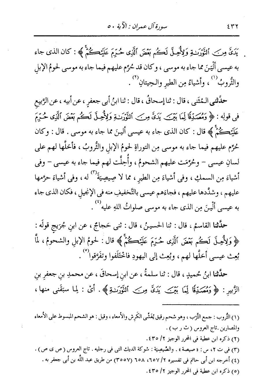 حَدَّثَنِي الْمُثَنَّى، قَالَ: ثنا إِسْحَاقُ، قَالَ: ثنا ابْنُ أَبِي جَعْفَرٍ، عَنْ أَبِيهِ، عَنِ الرَّبِيعِ، فِي قَوْلِهِ: {§وَمُصَدِّقًا لِمَا بَيْنَ يَدَيَّ مِنَ التَّوْرَاةِ وَلِأُحِلَّ لَكُمْ بَعْضَ الَّذِي حُرِّمَ عَلَيْكُمْ} [آل عمران: 50] قَالَ: " كَانَ الَّذِي جَاءَ بِهِ عِيسَى أَلْيَنَ مِنَ الَّذِي جَاءَ بِهِ مُوسَى، قَالَ: وَكَانَ حُرِّمَ عَلَيْهِمْ فِيمَا جَاءَ بِهِ مُوسَى مِنَ التَّوْرَاةِ لُحُومُ الْإِبِلِ وَالثَّرُوُبُ فَأَحَلَّهَا لَهُمْ عَلَى لِسَانِ عِيسَى، وَحُرِّمَتْ عَلَيْهِمُ الشُّحُومُ، وَأُحِلَّتْ لَهُمْ فِيمَا جَاءَ بِهِ عِيسَى، وَفِي أَشْيَاءَ مِنَ السَّمَكِ، وَفِي أَشْيَاءَ مِنَ الطَّيْرِ مِمَّا لَا صَيصِيَةَ لَهُ، وَفِي أَشْيَاءَ حَرَّمَهَا عَلَيْهِمْ، وَشَدَّدَهَا عَلَيْهِمْ، فَجَاءَهُمْ عِيسَى بِالتَّخْفِيفِ مِنْهُ فِي الْإِنْجِيلِ، فَكَانَ الَّذِي جَاءَ بِهِ عِيسَى أَلْيَنَ مِنَ الَّذِي جَاءَ بِهِ مُوسَى، صَلَوَاتُ اللَّهِ عَلَيْهِ "