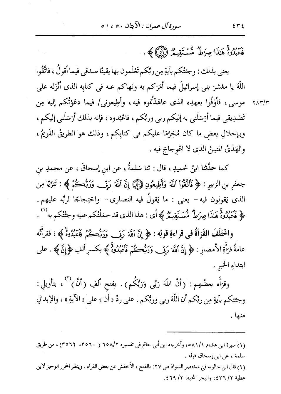 كَمَا: حَدَّثَنَا ابْنُ حُمَيْدٍ، قَالَ: ثنا سَلَمَةُ، عَنِ ابْنِ إِسْحَاقَ، عَنْ مُحَمَّدِ بْنِ جَعْفَرِ بْنِ الزُّبَيْرِ: {§فَاتَّقُوا اللَّهَ وَأَطِيعُونِ إِنَّ اللَّهَ رَبِّي وَرَبُّكُمْ} [آل عمران: 51] «تَبَرِّيًا مِنَ الَّذِي يَقُولُونَ فِيهِ، يَعْنِي مَا يَقُولُ فِيهِ النَّصَارَى وَاحْتِجَاجًا لِرَبِّهِ عَلَيْهِمْ» ، فَاعْبُدُوهُ وَ {هَذَا صِرَاطٌ مُسْتَقِيمٌ} [آل عمران: 51] «أَيِ الَّذِي هَذَا قَدْ حَمَلْتُكُمْ عَلَيْهِ وَجِئْتُكُمْ بِهِ» وَاخْتَلَفَتِ الْقُرَّاءُ فِي قِرَاءَةِ قَوْلِهِ: {إِنَّ اللَّهَ رَبِّي وَرَبُّكُمْ فَاعْبُدُوهُ} [آل عمران: 51] فَقَرَأَتْهُ عَامَّةُ قُرَّاءِ الْأَمْصَارِ: {إِنَّ اللَّهَ رَبِّي وَرَبُّكُمْ فَاعْبُدُوهُ} [آل عمران: 51] بِكَسْرِ أَلْفِ «إِنَّ» عَلَى ابْتِدَاءِ الْخَبَرِ، وَقَرَأَهُ بَعْضُهُمْ: «أَنَّ اللَّهَ رَبِّي وَرَبُّكُمْ» بِفَتْحِ أَلْفِ «أَنَّ» بِتَأْوِيلِ: وَجِئْتُكُمْ بِآيَةٍ مِنْ رَبِّكُمْ أَنَّ اللَّهَ رَبِّي وَرَبُّكُمْ، عَلَى رَدِّ أَنَّ عَلَى الْآيَةِ، وَالْإِبْدَالِ مِنْهَا.