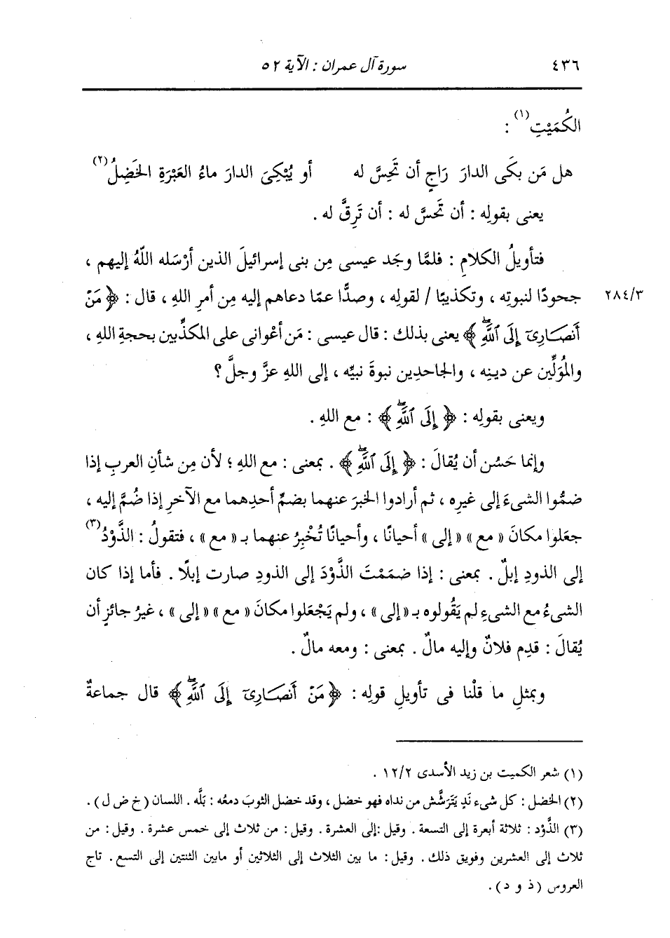 يَعْنِي بِقَوْلِهِ: أَنْ تُحِسَّ لَهُ: أَنْ تَرِقَّ لَهُ. فَتَأْوِيلُ الْكَلَامِ: فَلَمَّا وَجَدَ عِيسَى مِنْ بَنِي إِسْرَائِيلَ الَّذِينَ أَرْسَلَهُ اللَّهُ إِلَيْهِمْ جُحُودًا لِنُبُوَّتِهِ، وَتَكْذِيبًا لِقَوْلِهِ، وَصَدًّا عَمَّا دَعَاهُمْ إِلَيْهِ مِنْ أَمْرِ اللَّهِ، قَالَ: {مَنْ أَنْصَارِي إِلَى اللَّهِ} [آل عمران: 52] يَعْنِي بِذَلِكَ: قَالَ عِيسَى: مَنْ أَعْوَانِي عَلَى الْمُكَذِّبِينَ بِحُجَّةِ اللَّهِ، وَالْمُوَلِّينَ عَنْ دِينِهِ، وَالْجَاحِدِينَ نُبُوَّةَ نَبِيِّهِ إِلَى اللَّهِ عَزَّ وَجَلَّ، وَيَعْنِي بِقَوْلِهِ {إِلَى اللَّهِ} [البقرة: 275] مَعَ اللَّهِ، وَإِنَّمَا حَسُنَ أَنْ يُقَالَ إِلَى اللَّهِ، بِمَعْنَى: مَعَ اللَّهِ؛ لِأَنَّ مِنْ شَأْنِ الْعَرَبِ إِذَا ضَمُّوا الشَّيْءَ إِلَى غَيْرِهِ، ثُمَّ أَرَادُوا الْخَبَرَ عَنْهُمَا بِضَمِّ أَحَدِهِمَا مَعَ الْآخَرِ إِذَا ضُمَّ إِلَيْهِ جَعَلُوا مَكَانَ مَعَ إِلَى أَحْيَانًا، وَأَحْيَانًا تُخْبِرُ عَنْهُمَا بِ «مَعَ» فَتَقُولُ: الذُّودُ إِلَى الذُّودِ إِبِلٌ، بِمَعْنَى: إِذَا ضَمَمْتَ الذُّودَ إِلَى الذُّودِ صَارَتْ إِبِلًا، فَأَمَّا إِذَا كَانَ الشَّيْءُ مَعَ الشَّيْءِ لَمْ يَقُولُوهُ بِ «إِلَى» وَلَمْ يَجْعَلُوا مَكَانَ مَعَ إِلَى غَيْرَ جَائِزٍ أَنْ يُقَالَ: قَدِمَ فُلَانٌ وَإِلَيْهِ مَالٌ، بِمَعْنَى: وَمَعَهُ مَالٌ. وَبِمِثْلِ مَا قُلْنَا فِي تَأْوِيلِ قَوْلِهِ: {مَنْ أَنْصَارِي إِلَى اللَّهِ} [آل عمران: 52] قَالَ جَمَاعَةٌ