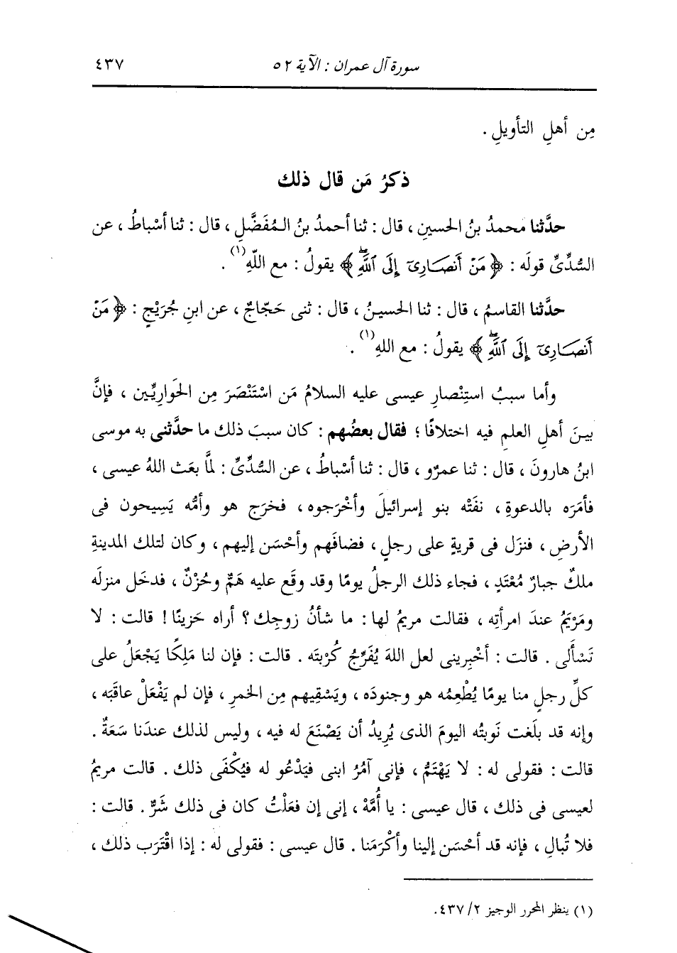 ذِكْرُ مَنْ قَالَ ذَلِكَ: حَدَّثَنِي مُحَمَّدُ بْنُ الْحُسَيْنِ، قَالَ: ثنا أَحْمَدُ بْنُ الْمُفَضَّلِ، قَالَ: ثنا أَسْبَاطٌ، عَنِ السُّدِّيِّ، قَوْلُهُ: {§مَنْ أَنْصَارِي إِلَى اللَّهِ} [آل عمران: 52] يَقُولُ: «مَعَ اللَّهِ»