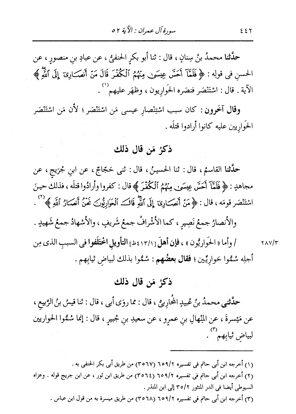 ذِكْرُ مَنْ قَالَ ذَلِكَ: حَدَّثَنَا الْقَاسِمُ، قَالَ: ثنا الْحُسَيْنُ، قَالَ: ثني حَجَّاجٌ، عَنِ ابْنِ جُرَيْجٍ، عَنْ مُجَاهِدٍ: {§فَلَمَّا أَحَسَّ عِيسَى مِنْهُمُ الْكُفْرَ} [آل عمران: 52] قَالَ: «كَفَرُوا وَأَرَادُوا قَتْلَهُ، فَذَلِكَ حِينَ اسْتَنْصَرَ قَوْمَهُ» قَالَ: {مَنْ أَنْصَارِي إِلَى اللَّهِ قَالَ الْحَوَارِيُّونَ نَحْنُ أَنْصَارُ اللَّهِ} [آل عمران: 52] وَالْأَنْصَارُ: جَمْعُ نُصَيْرٍ، كَمَا الْأَشْرَافُ جَمْعُ شَرِيفٍ، وَالْأَشْهَادُ جَمْعُ شَهِيدٍ وَأَمَّا الْحَوَارِيُّونِ، فَإِنَّ أَهْلَ التَّأْوِيلِ اخْتَلَفُوا فِي السَّبَبِ الَّذِي مِنْ أَجْلِهِ سُمُّوا حَوَارِيِّينَ، فَقَالَ بَعْضُهُمْ: سَمُّوا بِذَلِكَ لِبَيَاضِ ثِيَابِهِمْ
