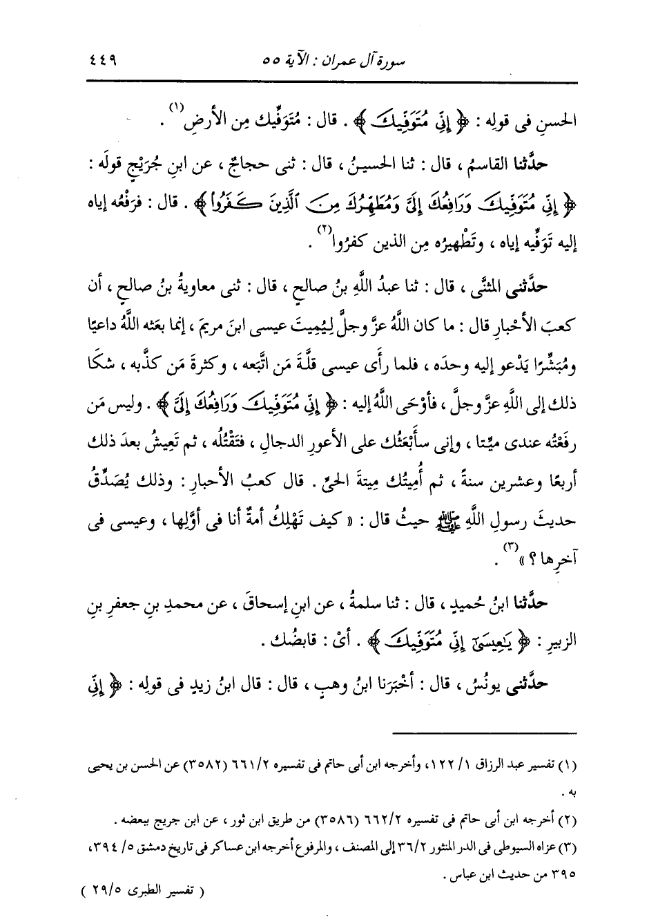 حَدَّثَنَا الْقَاسِمُ، قَالَ: ثنا الْحُسَيْنُ، قَالَ: ثني حَجَّاجٌ، عَنِ ابْنِ جُرَيْجٍ، قَوْلُهُ: {§إِنِّي مُتَوَفِّيكَ وَرَافِعُكَ إِلَيَّ وَمُطَهِّرُكَ مِنَ الَّذِينَ كَفَرُوا} [آل عمران: 55] قَالَ: «فَرَفَعَهُ اللَّهُ إِلَيْهِ، تَوَفِّيهِ إِيَّاهُ، وَتَطْهِيرُهُ مِنَ الَّذِينَ كَفَرُوا»