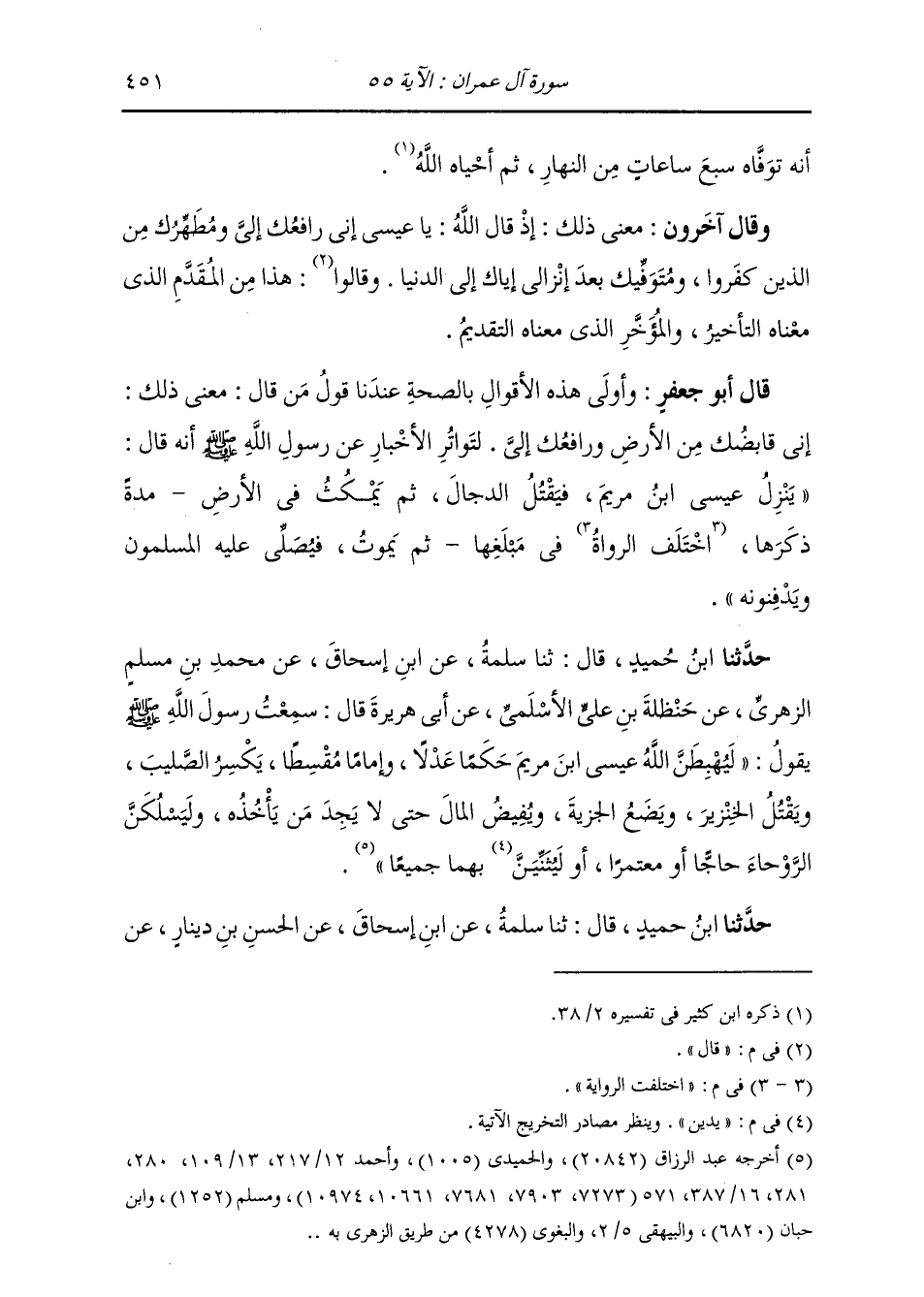 حَدَّثَنَا ابْنُ حُمَيْدٍ، قَالَ: ثنا سَلَمَةُ، عَنِ ابْنِ إِسْحَاقَ، عَنِ الْحَسَنِ بْنِ دِينَارٍ، عَنْ -[452]- قَتَادَةَ، عَنْ عَبْدِ الرَّحْمَنِ بْنِ آدَمَ، عَنْ أَبِي هُرَيْرَةَ، قَالَ: قَالَ رَسُولُ اللَّهِ صَلَّى اللهُ عَلَيْهِ وَسَلَّمَ: «§الْأَنْبِيَاءُ إِخْوَةٌ لِعَلَّاتٍ، أُمَّهَاتُهُمْ شَتَّى، وَدِينُهُمْ وَاحِدٌ، وَأَنَا أَوْلَى النَّاسِ بِعِيسَى ابْنِ مَرْيَمَ؛ لِأَنَّهُ لَمْ يَكُنْ بَيْنِي وَبَيْنَهُ نَبِيُّ، وَإِنَّهُ خَلِيفَتِي عَلَى أُمَّتِي، وَإِنَّهُ نَازِلٌ فَإِذَا رَأَيْتُمُوهُ فَاعْرِفُوهُ، فَإِنَّهُ رَجُلٌ مَرْبُوعُ الْخَلْقِ إِلَى الْحُمْرَةِ وَالْبَيَاضِ سَبْطُ الشَّعْرِ كَأَنَّ شَعْرَهُ يَقْطُرُ، وَإِنْ لَمْ يُصِبْهُ بَلَلٌ بَيْنَ مُمَصَّرَتَيْنِ، يَدُقُّ الصَّلِيبَ، وَيَقْتُلُ الْخِنْزِيرَ، وَيُفِيضُ الْمَالَ، وَيُقَاتِلُ النَّاسَ عَلَى الْإِسْلَامِ حَتَّى يُهْلِكَ اللَّهُ فِي زَمَانِهِ الْمِلَلَ كُلَّهَا، وَيُهْلِكَ اللَّهُ فِي زَمَانِهِ مَسِيخَ الضَّلَالَةِ الْكَذَّابَ الدَّجَّالَ وَتَقَعُ فِي الْأَرْضِ الْأَمَنَةُ حَتَّى تَرْتَعَ الْأَسْوَدُ مَعَ الْإِبِلِ، وَالنَّمِرُ مَعَ الْبَقَرِ، وَالذِّئَابُ مَعَ الْغَنَمِ، وَتَلْعَبُ الْغِلْمَانُ بِالْحَيَّاتِ، لَا يَضُرُّ بَعْضُهُمْ بَعْضًا، فَيَثْبُتُ فِي الْأَرْضِ أَرْبَعِينَ سَنَةً، ثُمَّ يُتَوَفَّى وَيُصَلِّي الْمُسْلِمُونَ عَلَيْهِ وَيَدْفِنُونَهُ» قَالَ أَبُو جَعْفَرٍ: وَمَعْلُومٌ أَنَّهُ لَوْ كَانَ قَدْ أَمَاتَهُ اللَّهُ عَزَّ وَجَلَّ لَمْ يَكُنْ بِالَّذِي يُمِيتُهُ مَيْتَةً أُخْرَى، فَيَجْمَعُ عَلَيْهِ مَيْتَتَيْنِ؛ لِأَنَّ اللَّهَ عَزَّ وَجَلَّ إِنَّمَا أَخْبَرَ عِبَادَهُ أَنَّهُ يَخْلُقُهُمْ ثُمَّ يُمِيتَهُمْ، ثُمَّ يُحْيِيهِمْ، كَمَا قَالَ جَلَّ ثناؤُهُ {اللَّهُ الَّذِي خَلَقَكُمْ ثُمَّ رَزَقَكُمْ ثُمَّ يُمِيتُكُمْ ثُمَّ يُحْيِيكُمْ هَلْ مِنْ شُرَكَائِكِمْ مَنْ يَفْعَلُ مِنْ ذَلِكُمْ مِنْ شَيْءٍ} [الروم: 40] فَتَأْوِيلُ الْآيَةِ إِذًا: قَالَ اللَّهُ لِعِيسَى: يَا عِيسَى إِنِّي قَابِضُكَ مِنَ الْأَرْضِ وَرَافِعُكَ إِلَيَّ، وَمُطَهِّرُكَ مِنَ الَّذِينَ كَفَرُوا، فَجَحَدُوا نُبُوَّتَكَ، وَهَذَا الْخَبَرُ وَإِنْ كَانَ مَخْرَجُهُ مَخْرَجَ خَبَرٍ، فَإِنَّ فِيهِ مِنَ اللَّهِ عَزَّ وَجَلَّ احْتِجَاجًا عَلَى الَّذِينَ حَاجُّوا رَسُولَ اللَّهِ صَلَّى اللهُ عَلَيْهِ وَسَلَّمَ فِي عِيسَى مِنْ وَفْدِ نَجْرَانَ بِأَنَّ عِيسَى لَمْ يُقْتَلْ وَلَمْ -[453]- يُصْلَبْ كَمَا زَعَمُوا، وَأَنَّهُمْ وَالْيَهُودُ الَّذِينَ أَقَرُّوا بِذَلِكَ وَادَّعُوا عَلَى عِيسَى كَذْبَةٌ فِي دَعْوَاهُمْ وَزَعْمِهِمْ