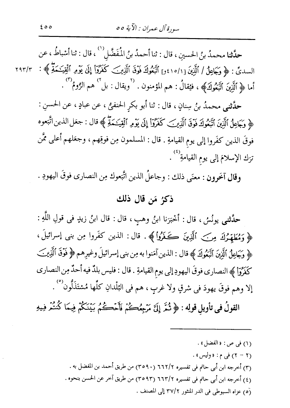 حَدَّثَنَا مُحَمَّدُ بْنُ الْحُسَيْنِ، قَالَ: ثنا أَحْمَدُ بْنُ الْمُفَضَّلِ، قَالَ: ثنا أَسْبَاطٌ، عَنِ السُّدِّيِّ: {§وَجَاعِلُ الَّذِينَ اتَّبَعُوكَ فَوْقَ الَّذِينَ كَفَرُوا إِلَى يَوْمِ الْقِيَامَةِ} [آل عمران: 55] " أَمَّا الَّذِينَ اتَّبَعُوكَ، فَيُقَالُ: هُمُ الْمُؤْمِنُونَ وَلَيْسَ هُمُ الرُّومُ "