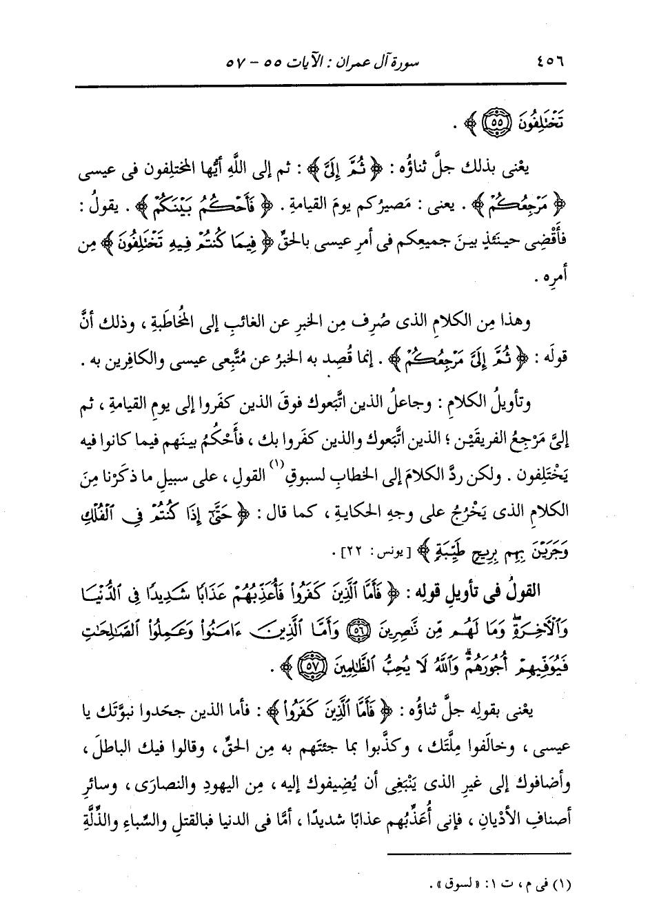 تَخْتَلِفُونَ} [آل عمران: 55] يَعْنِي بِذَلِكَ جَلَّ ثناؤُهُ: {ثُمَّ إِلَيَّ} [آل عمران: 55] ثُمَّ إِلَى اللَّهِ أَيُّهَا الْمُخْتَلِفُونَ فِي عِيسَى، {مَرْجِعُكُمْ} [آل عمران: 55] يَعْنِي مَصِيرَكُمْ يَوْمَ الْقِيَامَةِ {فَأَحْكُمْ بَيْنَكُمْ} [آل عمران: 55] يَقُولُ: فَأَقْضِي حِينَئِذٍ بَيْنَ جَمِيعِكُمْ فِي أَمْرِ عِيسَى بِالْحَقِّ فِيمَا كُنْتُمْ فِيهِ تَخْتَلِفُونَ مِنْ أَمْرِهِ. وَهَذَا مِنَ الْكَلَامِ الَّذِي صُرِفَ مِنَ الْخَبَرِ عَنِ الْغَائِبِ إِلَى الْمُخَاطَبَةِ، وَذَلِكَ أَنَّ قَوْلَهُ: {ثُمَّ إِلَيَّ مَرْجِعُكُمْ} [آل عمران: 55] إِنَّمَا قُصِدَ بِهِ الْخَبَرُ عَنْ مُتَّبِعِي عِيسَى وَالْكَافِرِينَ بِهِ. وَتَأْوِيلُ. الْكَلَامِ: وَجَاعِلُ الَّذِينَ اتَّبَعُوكَ فَوْقَ الَّذِينَ كَفَرُوا إِلَى يَوْمِ الْقِيَامَةِ، ثُمَّ إِلَيَّ مَرْجِعُ الْفَرِيقَيْنِ: الَّذِينَ اتَّبَعُوكَ، وَالَّذِينَ كَفَرُوا بِكَ، فَأَحْكُمُ بَيْنَهُمْ فِيمَا كَانُوا فِيهِ يَخْتَلِفُونَ، وَلَكِنْ رُدَّ الْكَلَامُ إِلَى الْخَطَّابِ لِسُبُوقِ الْقَوْلِ عَلَى سَبِيلِ مَا ذَكَرْنَا مِنَ الْكَلَامِ الَّذِي يَخْرُجُ عَلَى وَجْهِ الْحِكَايَةِ، كَمَا قَالَ: {حَتَّى إِذَا كُنْتُمْ فِي الْفُلْكِ وَجَرَيْنَ بِهِمْ بِرِيحٍ طَيْبَةٍ} [يونس: 22]