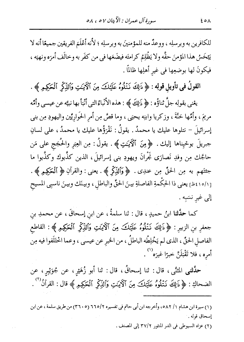 كَمَا: حَدَّثَنَا ابْنُ حُمَيْدٍ، قَالَ: ثنا سَلَمَةُ، عَنِ ابْنِ إِسْحَاقَ، عَنْ مُحَمَّدِ بْنِ جَعْفَرِ بْنِ الزُّبَيْرِ: {§ذَلِكَ نَتْلُوهُ عَلَيْكَ مِنَ الْآيَاتِ وَالذِّكْرِ الْحَكِيمِ} [آل عمران: 58] «الْقَاطِعِ الْفَاصِلِ الْحَقِّ الَّذِي لَمْ يَخْلِطْهُ الْبَاطِلُ مِنَ الْخَبَرِ عَنْ عِيسَى، وَعَمَّا اخْتَلَفُوا فِيهِ مِنْ أَمْرِهِ، فَلَا تَقْبَلَنَّ خَبَرًا غَيْرَهُ»