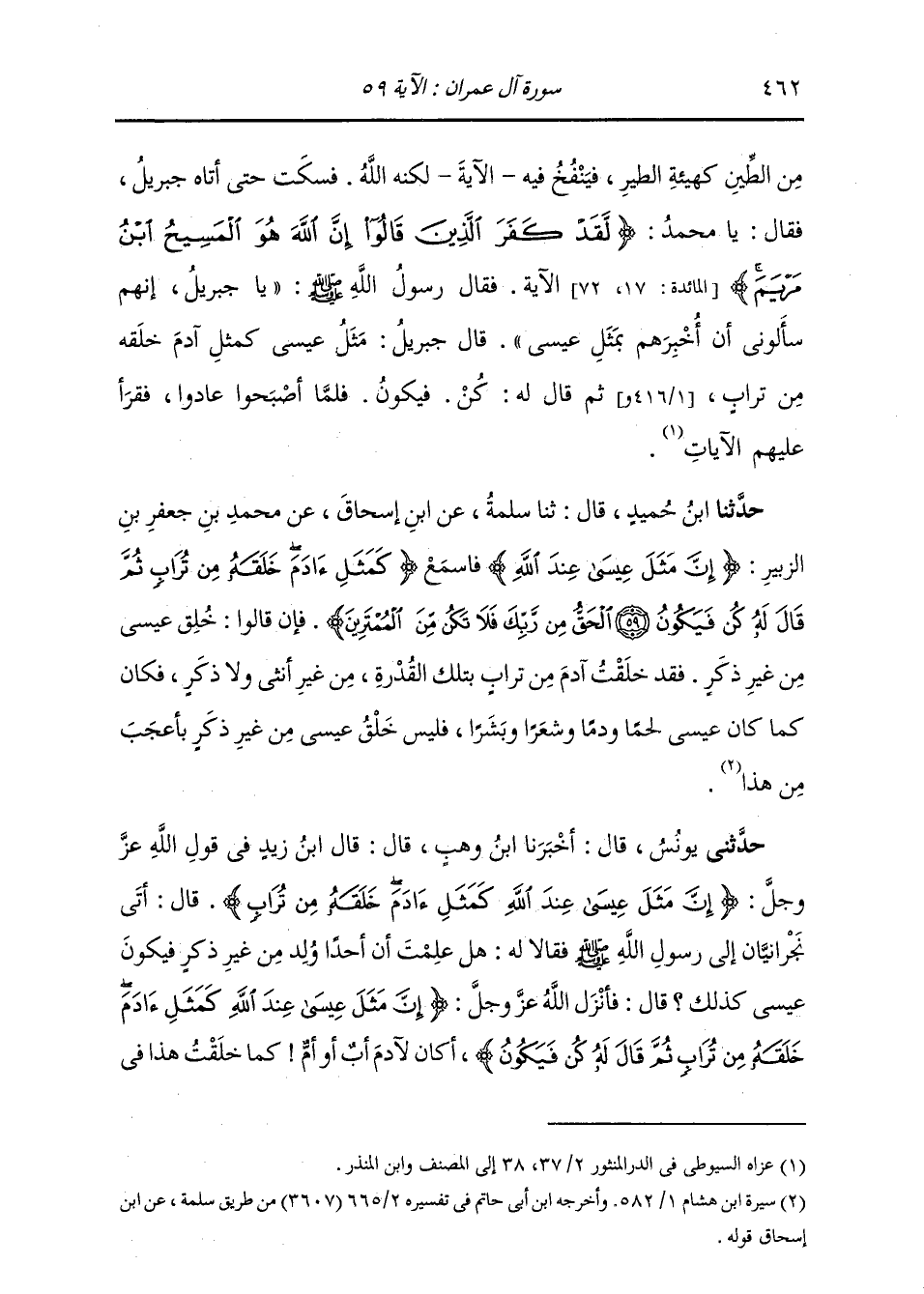 حَدَّثَنَا ابْنُ حُمَيْدٍ، قَالَ: ثنا سَلَمَةُ، عَنِ ابْنِ إِسْحَاقَ، عَنْ مُحَمَّدِ بْنِ جَعْفَرِ بْنِ الزُّبَيْرِ: {إِنَّ §مَثَلَ عِيسَى عِنْدَ اللَّهِ} [آل عمران: 59] فَاسْمَعْ {كَمَثَلِ آدَمَ خَلَقَهُ مِنْ تُرَابٍ ثُمَّ قَالَ لَهُ كُنْ فَيَكُونُ، الْحَقُّ مِنْ رَبِّكِ فَلَا تَكُنْ مِنَ الْمُمْتَرِينَ} [آل عمران: 60] " فَإِنْ قَالُوا: خُلِقَ عِيسَى مِنْ غَيْرِ ذَكَرٍ، فَقَدْ خَلَقْتُ آدَمَ مِنْ تُرَابٍ بِتِلْكَ الْقُدْرَةِ، مِنْ غَيْرِ أُنْثًى وَلَا ذَكَرٍ فَكَانَ كَمَا كَانَ عِيسَى لَحْمًا وَدَمًا وَشَعْرًا وَبَشَرًا، فَلَيْسَ خَلْقُ عِيسَى مِنْ غَيْرِ ذَكَرٍ بِأَعْجَبَ مِنْ هَذَا "
