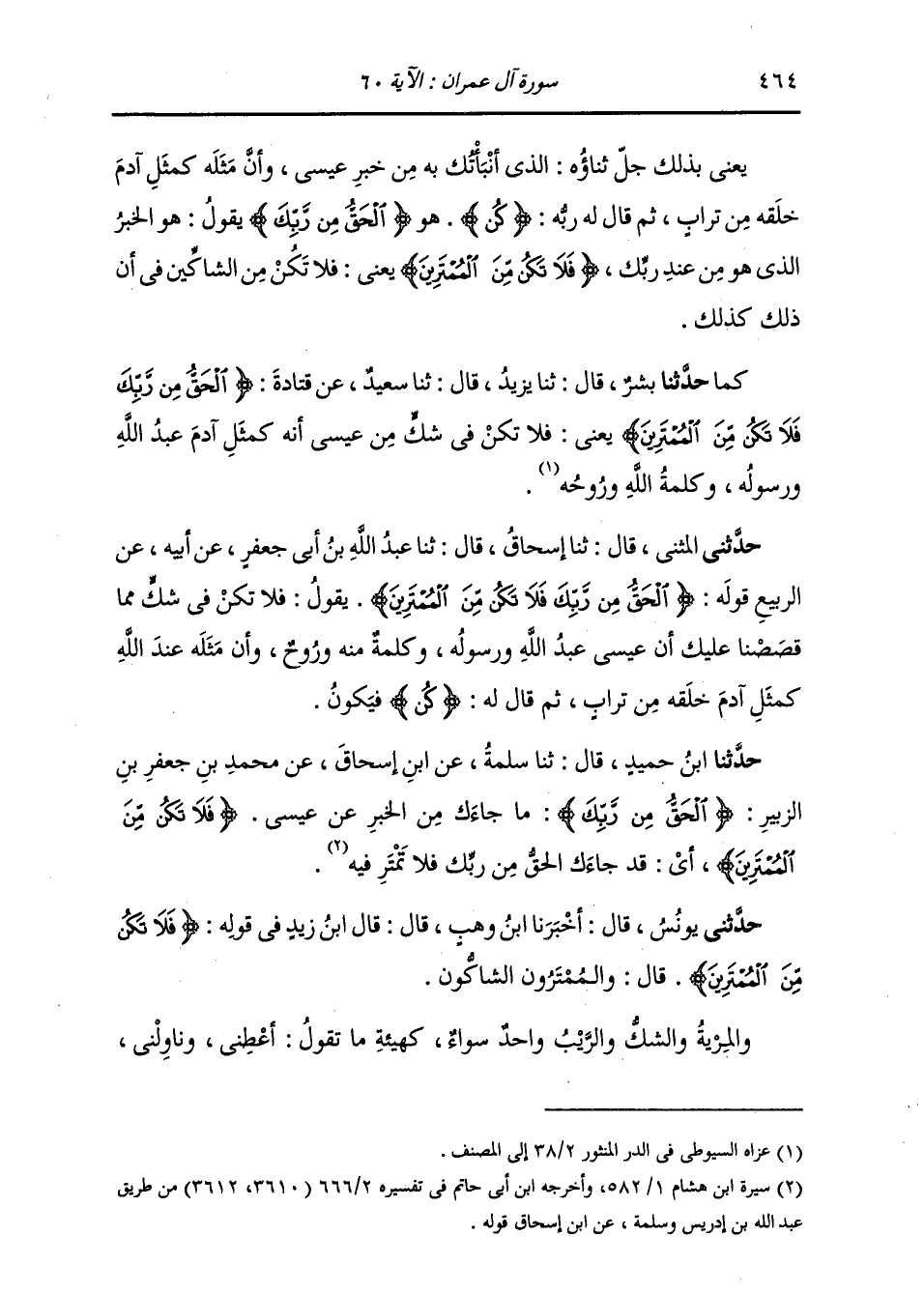 حَدَّثَنَا ابْنُ حُمَيْدٍ، قَالَ: ثنا سَلَمَةُ، عَنِ ابْنِ إِسْحَاقَ، عَنْ مُحَمَّدِ بْنِ جَعْفَرِ بْنِ الزُّبَيْرِ: {§الْحَقُّ مِنْ رَبِّكَ} [البقرة: 147] «مَا جَاءَكَ مِنَ الْخَبَرِ عَنْ عِيسَى» ، {فَلَا تَكُنْ مِنَ الْمُمْتَرِينَ} [آل عمران: 60] «أَيْ قَدْ جَاءَكَ الْحَقُّ مِنْ رَبِّكَ فَلَا تَمْتَرِ فِيهِ»