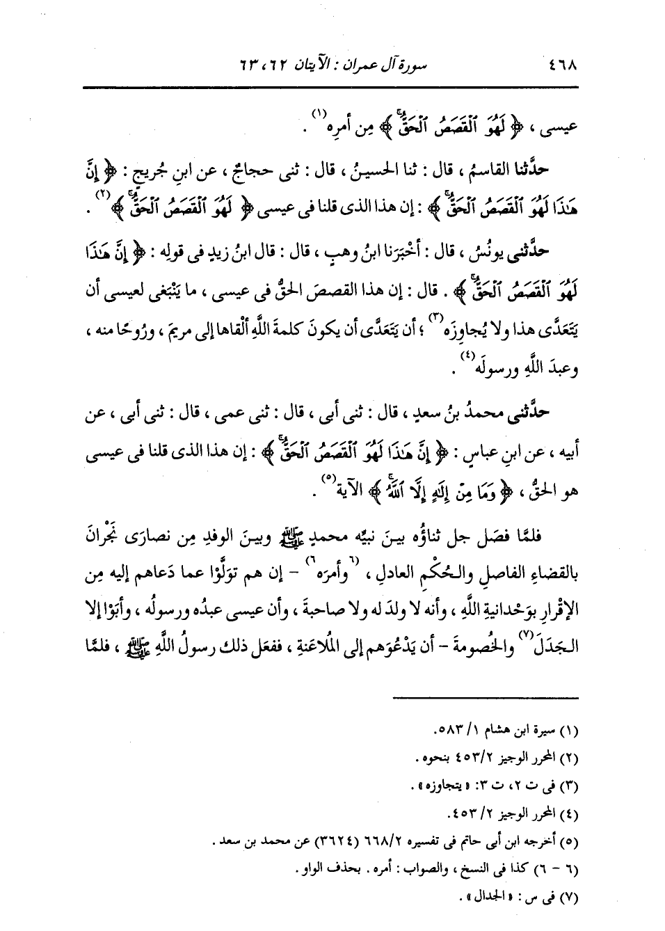 حَدَّثَنِي مُحَمَّدُ بْنُ سَعْدٍ، قَالَ: ثني أَبِي، قَالَ: ثني عَمِّي، قَالَ: ثني أَبِي، عَنْ أَبِيهِ، عَنِ ابْنِ عَبَّاسٍ: {إِنَّ §هَذَا لَهُوَ الْقَصَصُ الْحَقُّ} [آل عمران: 62] «إِنَّ هَذَا الَّذِي قُلْنَا فِي عِيسَى هُوَ الْحَقُّ» {وَمَا مِنْ إِلَهِ إِلَّا اللَّهُ} [آل عمران: 62] الْآيَةَ فَلَمَّا فَصَلَ جَلَّ ثناؤُهُ بَيْنَ نَبِيِّهِ مُحَمَّدٍ صَلَّى اللهُ عَلَيْهِ وَسَلَّمَ وَبَيْنَ الْوَفْدِ مِنْ نَصَارَى نَجْرَانَ بِالْقَضَاءِ الْفَاصِلِ وَالْحُكْمِ الْعَادِلِ أَمَرَهُ إِنْ هُمْ تَوَلَّوْا عَمَّا دَعَاهُمْ إِلَيْهِ مِنَ الْإِقْرَارِ بِوَحْدَانِيَّةِ اللَّهِ، وَأَنَّهُ لَا وَلَدَ لَهُ وَلَا صَاحِبَةً، وَأَنَّ عِيسَى عَبْدُهُ وَرَسُولُهُ وَأَبَوْا إِلَّا الْجَدَلَ وَالْخُصُومَةَ أَنْ يَدْعُوَهُمَ إِلَى الْمُلَاعَنَةِ، فَفَعَلَ ذَلِكَ رَسُولُ اللَّهِ صَلَّى اللهُ عَلَيْهِ وَسَلَّمَ، فَلَمَّا -[469]- فَعَلَ ذَلِكَ رَسُولُ اللَّهِ صَلَّى اللهُ عَلَيْهِ وَسَلَّمَ انْخَذَلُوا، فَامْتَنَعُوا مِنَ الْمُلَاعَنَةِ وَدَعَوْا إِلَى الْمُصَالَحَةِ