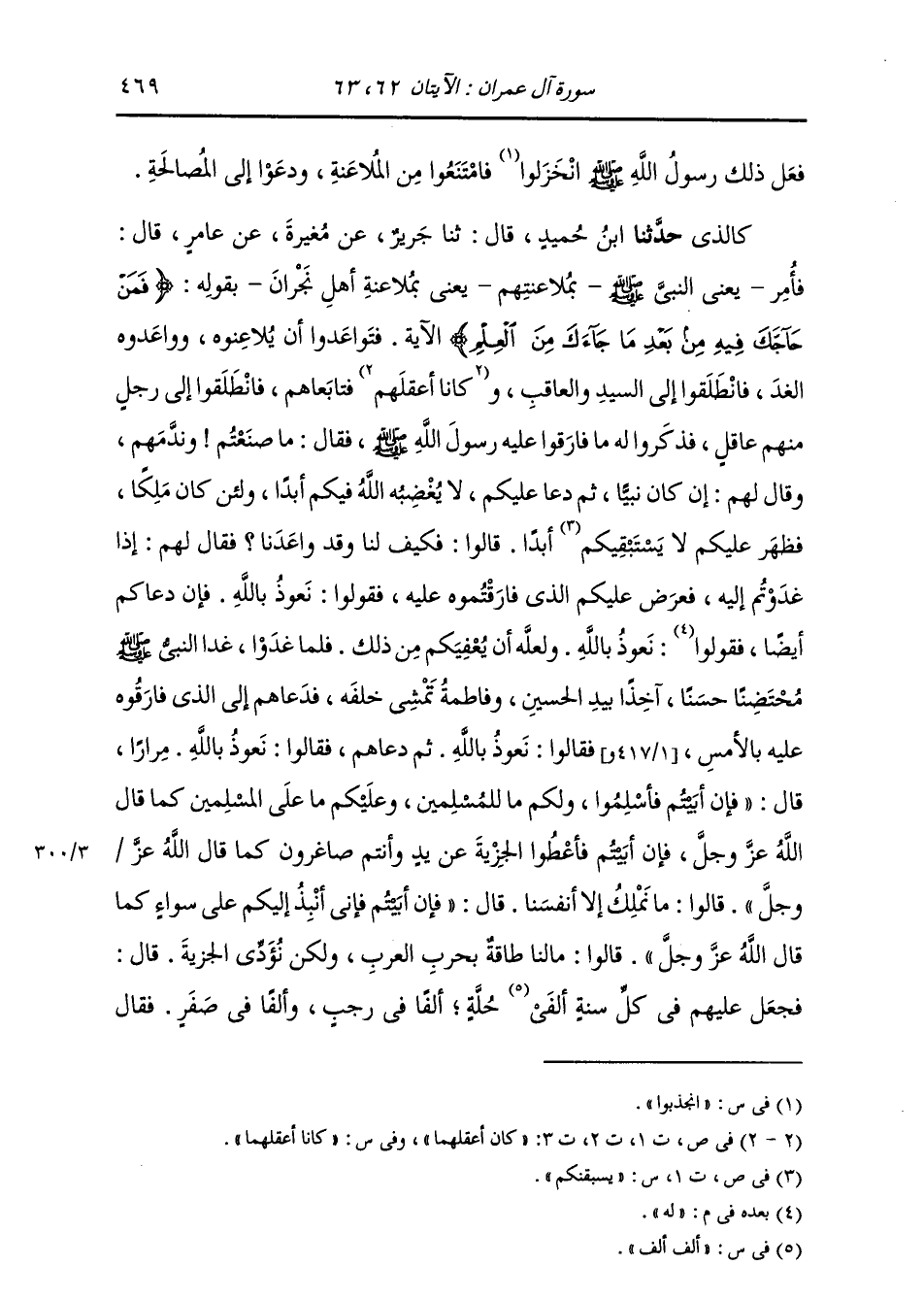 كَالَّذِي: حَدَّثَنَا ابْنُ حُمَيْدٍ، قَالَ: ثنا جَرِيرٌ، عَنْ مُغِيرَةَ، عَنْ عَامِرٍ، قَالَ: فَأَمَرَ يَعْنِي النَّبِيَّ صَلَّى اللهُ عَلَيْهِ وَسَلَّمَ بِمُلَاعَنَتِهِمْ يَعْنِي §بِمُلَاعَنَةِ أَهْلِ نَجْرَانَ بِقَوْلِهِ: {فَمَنْ حَاجَّكَ فِيهِ مِنْ بَعْدِ مَا جَاءَكَ مِنَ الْعِلْمِ} [آل عمران: 61] الْآيَةَ، فَتَوَاعَدُوا أَنْ يُلَاعِنُوهُ، وَوَاعَدُوهُ الْغَدَ، فَانْطَلَقُوا إِلَى السَّيِّدِ وَالْعَاقِبِ وَكَانَا أَعْقَلَهُمْ فَتَابَعَاهُمْ، فَانْطَلَقُوا إِلَى رَجُلٍ مِنْهُمْ عَاقِلٍ، فَذَكَرُوا لَهُ مَا فَارَقُوا عَلَيْهِ رَسُولَ اللَّهِ صَلَّى اللهُ عَلَيْهِ وَسَلَّمَ فَقَالَ: مَا صَنَعْتُمْ؟ وَنَدَّمَهُمْ، وَقَالَ لَهُمْ: إِنْ كَانَ نَبِيًّا ثُمَّ دَعَا عَلَيْكُمْ لَا يُغْضِبُهُ اللَّهُ فِيكُمْ أَبَدًا، وَلَئِنْ كَانَ مَلِكًا فَظَهَرَ عَلَيْكُمْ لَا يَسْتَبْقِيكُمْ أَبَدًا، قَالُوا: فَكَيْفَ لَنَا وَقَدْ وَاعَدَنَا؟ فَقَالَ لَهُمْ: إِذَا غَدَوْتُمْ إِلَيْهِ فَعَرَضَ عَلَيْكُمُ الَّذِي فَارَقْتُمُوهُ عَلَيْهِ، فَقُولُوا: نَعُوذُ بِاللَّهِ فَإِنْ دَعَاكُمْ أَيْضًا، فَقُولُوا لَهُ: نَعُوذُ بِاللَّهِ وَلَعَلَّهُ أَنْ يُعْفِيَكُمْ مِنْ ذَلِكَ، فَلَمَّا غَدَوْا غَدَا النَّبِيُّ صَلَّى اللهُ عَلَيْهِ وَسَلَّمَ مُحْتَضِنًا حَسَنًا آخِذًا بِيَدِ الْحُسَيْنِ وَفَاطِمَةُ تَمْشِي خَلْفَهُ، فَدَعَاهُمْ إِلَى الَّذِي فَارَقُوهُ عَلَيْهِ بِالْأَمْسِ، فَقَالُوا: نَعُوذُ بِاللَّهِ ثُمَّ دَعَاهُمْ، فَقَالُوا: نَعُوذُ بِاللَّهِ مِرَارًا، قَالَ: «فَإِنْ أَبَيْتُمْ فَأَسْلِمُوا وَلَكُمْ مَا لِلْمُسْلِمِينَ وَعَلَيْكُمْ مَا عَلَى الْمُسْلِمِينَ، كَمَا قَالَ اللَّهُ عَزَّ وَجَلَّ؛ فَإِنْ أَبَيْتُمْ فَأَعْطُوا الْجِزْيَةَ عَنْ يَدٍ وَأَنْتُمْ صَاغِرُونَ، كَمَا قَالَ اللَّهُ عَزَّ وَجَلَّ» ، قَالُوا: مَا نَمْلِكُ إِلَّا أَنْفُسَنَا، قَالَ: «فَإِنْ أَبَيْتُمْ فَإِنِّي أَنْبِذُ إِلَيْكُمْ عَلَى سَوَاءٍ، كَمَا قَالَ اللَّهُ عَزَّ وَجَلَّ» ، قَالُوا: مَا لَنَا طَاقَةٌ بِحَرْبِ الْعَرَبِ، وَلَكِنْ نُؤَدِّي الْجِزْيَةَ، قَالَ: فَجَعَلَ عَلَيْهِمْ فِي كُلِّ سَنَةٍ أَلْفَيْ حُلَّةٍ، أَلْفًا فِي رَجَبٍ وَأَلْفًا فِي صَفَرٍ. فَقَالَ -[470]- النَّبِيُّ صَلَّى اللهُ عَلَيْهِ وَسَلَّمَ: «قَدْ أَتَانِي الْبَشِيرُ بِهَلَكَةِ أَهْلِ نَجْرَانَ حَتَّى الطَّيْرُ عَلَى الشَّجَرِ أَوِ الْعَصَافِيرُ عَلَى الشَّجَرِ، لَوْ تَمُّوا عَلَى الْمُلَاعَنَةِ» حَدَّثَنَا ابْنُ حُمَيْدٍ، قَالَ: ثنا جَرِيرٌ، قَالَ: فَقُلْتُ لِلْمُغِيرَةِ: إِنَّ النَّاسَ يَرَوْنَ فِي حَدِيثِ أَهْلِ نَجْرَانَ أَنَّ عَلِيًّا كَانَ مَعَهُمْ، فَقَالَ: أَمَّا الشَّعْبِيُّ فَلَمْ يَذْكُرْهُ، فَلَا أَدْرِي لِسُوءِ رَأْيِ بَنِي أُمَيَّةَ فِي عَلِيٍّ، أَوْ لَمْ يَكُنْ فِي الْحَدِيثِ؟