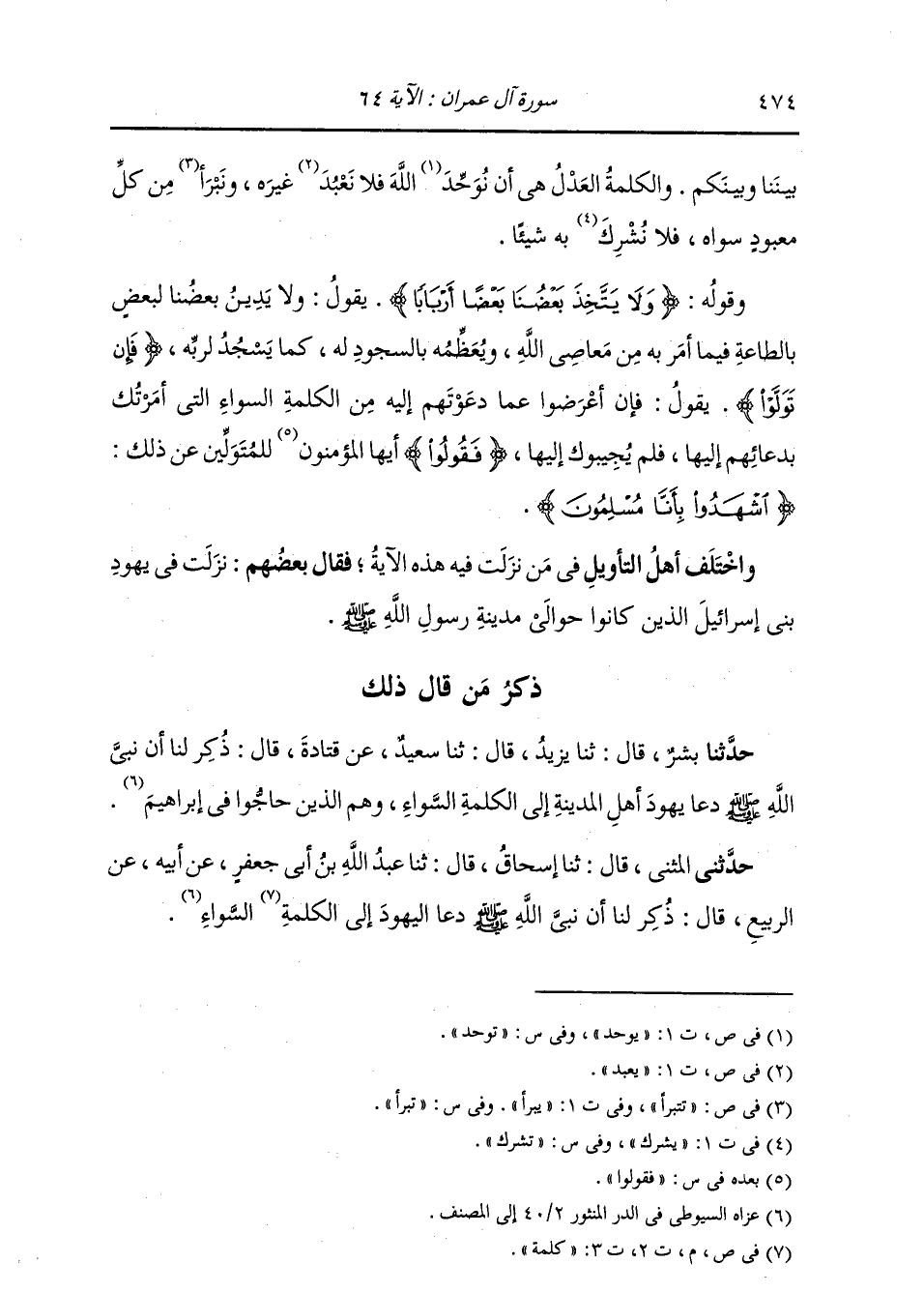 ذِكْرُ مَنْ قَالَ ذَلِكَ: حَدَّثَنَا بِشْرٌ، قَالَ: ثنا يَزِيدُ، قَالَ: ثنا سَعِيدٌ، عَنْ قَتَادَةَ، قَالَ: «ذُكِرَ لَنَا أَنَّ نَبِيَّ اللَّهِ صَلَّى اللهُ عَلَيْهِ وَسَلَّمَ §دَعَا يَهُودَ أَهْلِ الْمَدِينَةِ إِلَى الْكَلِمَةِ السَّوَاءِ، وَهُمُ الَّذِينَ حَاجُّوا فِي إِبْرَاهِيمَ»
