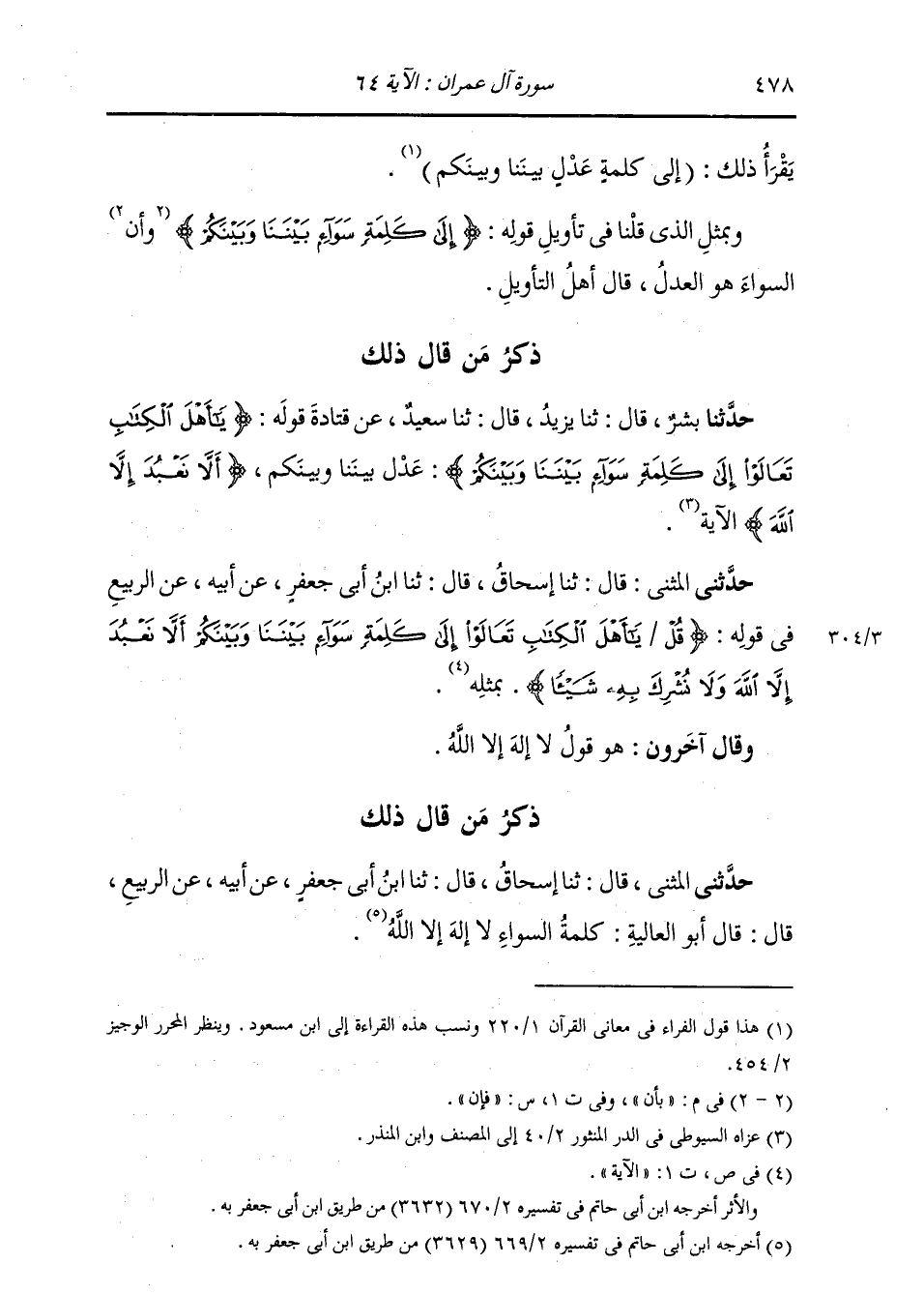 ذِكْرُ مَنْ قَالَ ذَلِكَ: حَدَّثَنَا بِشْرٌ، قَالَ: ثنا يَزِيدُ، قَالَ: ثنا سَعِيدٌ، عَنْ قَتَادَةَ، قَوْلُهُ: {§يَا أَهْلَ الْكِتَابِ تَعَالَوْا إِلَى كَلِمَةٍ سَوَاءٍ بَيْنَنَا وَبَيْنَكُمْ} [آل عمران: 64] «عَدْلٍ بَيْنَنَا وَبَيْنَكُمْ» {أَلَّا نَعْبُدَ إِلَّا اللَّهَ} [آل عمران: 64] الْآيَةَ حَدَّثَنَا الْمُثَنَّى، قَالَ: ثنا إِسْحَاقُ، قَالَ: ثنا ابْنُ أَبِي جَعْفَرٍ، عَنْ أَبِيهِ، عَنِ الرَّبِيعِ، فِي قَوْلِهِ: {قُلْ يَا أَهْلَ الْكِتَابِ تَعَالَوْا إِلَى كَلِمَةٍ سَوَاءٍ بَيْنَنَا وَبَيْنَكُمْ أَلَّا نَعْبُدَ إِلَّا اللَّهَ وَلَا نُشْرِكَ بِهِ شَيْئًا} [آل عمران: 64] بِمِثْلِهِ. وَقَالَ آخَرُونَ: هُوَ قَوْلُ لَا إِلَهَ إِلَّا اللَّهُ