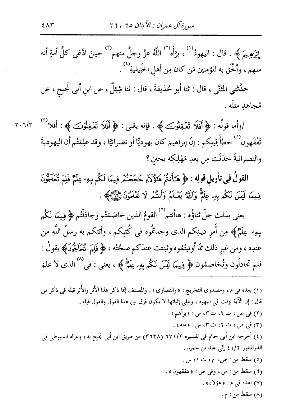 §الْقَوْلُ فِي تَأْوِيلِ قَوْلِهِ تَعَالَى: {هَا أَنْتُمْ هَؤُلَاءِ حَاجَجْتُمْ فِيمَا لَكُمْ بِهِ عِلْمٌ فَلِمَا تُحَاجُّونَ فِيمَا لَيْسَ لَكُمْ بِهِ عِلْمٌ وَاللَّهُ يَعْلَمُ وَأَنْتُمْ لَا تَعْلَمُونَ} يَعْنِي بِذَلِكَ جَلَّ ثناؤُهُ: {هَا أَنْتُمْ} هَؤُلَاءِ الْقَوْمُ الَّذِينَ خَاصَمْتُمْ وَجَادَلْتُمْ فِيمَا لَكُمْ بِهِ عِلْمٌ مِنْ أَمْرِ دِينِكُمُ الَّذِي وَجَدْتُمُوهُ فِي كُتُبِكُمْ، وَأَتَتْكُمْ بِهِ رُسُلُ اللَّهِ مِنْ عِنْدِهِ، وَفِي غَيْرِ ذَلِكَ مِمَّا أُوتِيتُمُوهُ، وَثَبَتَتْ عِنْدَكُمْ صِحَّتُهُ، فَلِمَ تُحَاجُّونَ؟ يَقُولُ: فَلِمَ تُجَادِلُونَ وَتُخَاصِمُونَ فِيمَا لَيْسَ لَكُمْ بِهِ عِلْمٌ؟ يَعْنِي الَّذِي لَا عِلْمَ -[484]- لَكُمْ بِهِ مِنْ أَمْرِ إِبْرَاهِيمَ وَدِينِهِ، وَلَمْ تَجِدُوهُ فِي كُتُبِ اللَّهِ، وَلَا أَتَتْكُمْ بِهِ أَنْبِيَاؤُكُمْ، وَلَا شَاهَدْتُمُوهُ فَتَعْلَمُوهُ