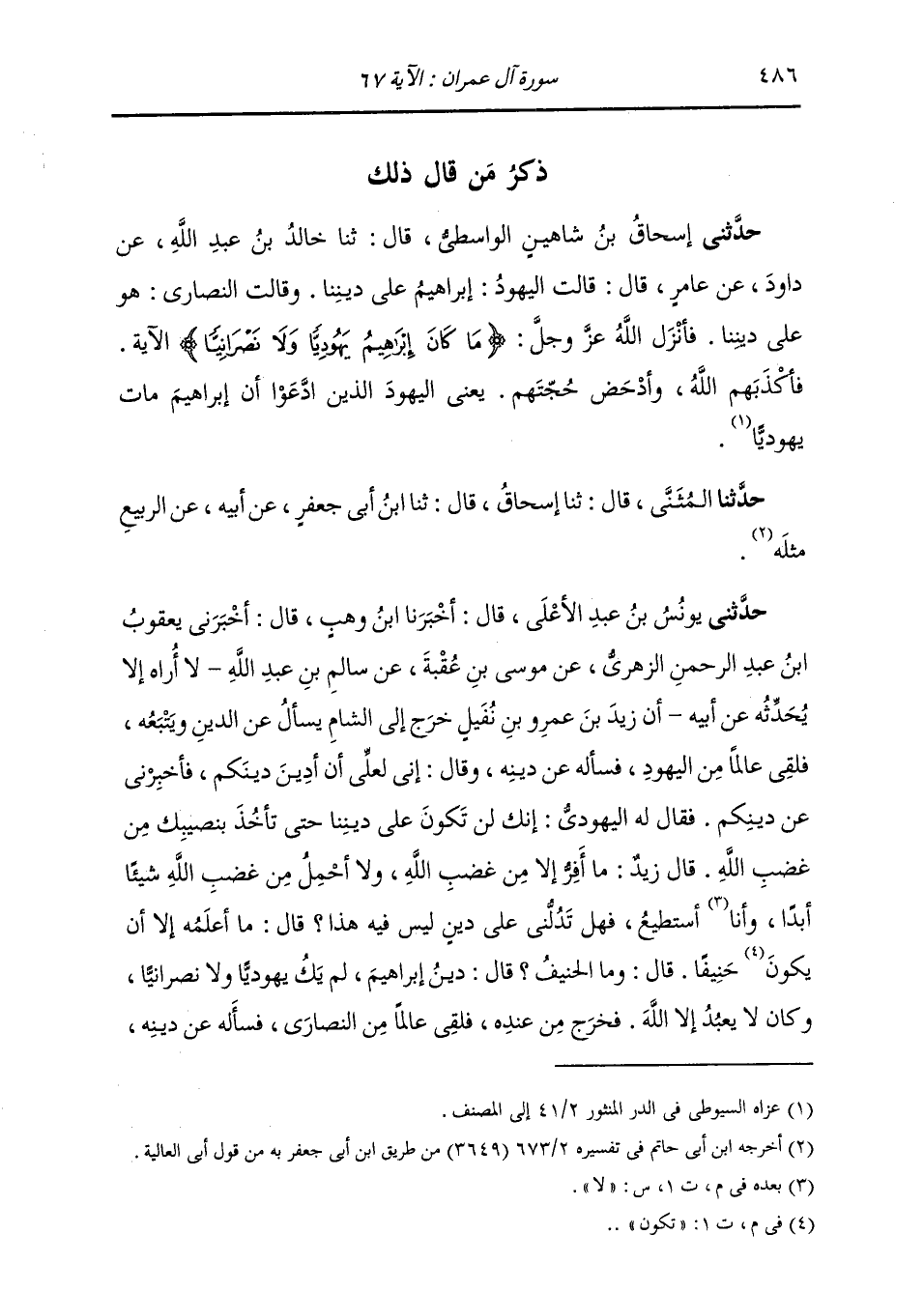 ذِكْرُ مَنْ قَالَ ذَلِكَ: حَدَّثَنِي إِسْحَاقُ بْنُ شَاهِينَ الْوَاسِطِيُّ، قَالَ: ثنا خَالِدُ بْنُ عَبْدِ اللَّهِ، عَنْ دَاوُدَ، عَنْ عَامِرٍ، قَالَ: " قَالَتِ الْيَهُودُ: إِبْرَاهِيمُ عَلَى دِينِنَا، وَقَالَتِ النَّصَارَى: هُوَ عَلَى دِينِنَا، فَأَنْزَلَ اللَّهُ عَزَّ وَجَلَّ ": {§مَا كَانَ إِبْرَاهِيمُ يَهُودِيًّا وَلَا نَصْرَانِيًّا} [آل عمران: 67] الْآيَةَ، «فَأَكْذَبَهُمُ اللَّهُ، وَأَدْحَضَ حُجَّتَهُمْ، يَعْنِي الْيَهُودَ الَّذِينَ ادَّعَوْا أَنَّ إِبْرَاهِيمَ مَاتَ يَهُودِيًّا» حَدَّثَنَا الْمُثَنَّى، قَالَ: ثنا إِسْحَاقُ، قَالَ: ثنا ابْنُ أَبِي جَعْفَرٍ، عَنْ أَبِيهِ، عَنِ الرَّبِيعِ، مِثْلَهُ
