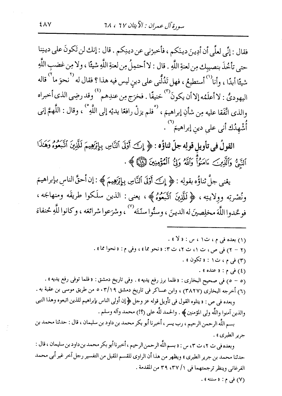 §الْقَوْلُ فِي تَأْوِيلِ قَوْلِهِ تَعَالَى: {إِنَّ أَوْلَى النَّاسِ بِإِبْرَاهِيمَ لَلَّذِينَ اتَّبَعُوهُ وَهَذَا النَّبِيُّ وَالَّذِينَ آمَنُوا وَاللَّهُ وَلِيُّ الْمُؤْمِنِينَ} [آل عمران: 68] يَعْنِي جَلَّ ثناؤُهُ بِقَوْلِهِ: {إِنَّ أَوْلَى النَّاسِ بِإِبْرَاهِيمَ} [آل عمران: 68] إِنَّ أَحَقَّ النَّاسِ بِإِبْرَاهِيمَ وَنُصْرَتِهِ وَوِلَايَتِهِ {لَلَّذِينَ اتَّبَعُوهُ} [آل عمران: 68] يَعْنِي الَّذِينَ سَلَكُوا طَرِيقَهُ وَمِنْهَاجَهُ، فَوَحَّدُوا اللَّهَ مُخْلِصِينَ لَهُ الدِّينَ وَسَنُّوا سُنَنَهُ وَشَرَّعُوا شَرَائِعَهُ وَكَانُوا لِلَّهِ حُنَفَاءَ