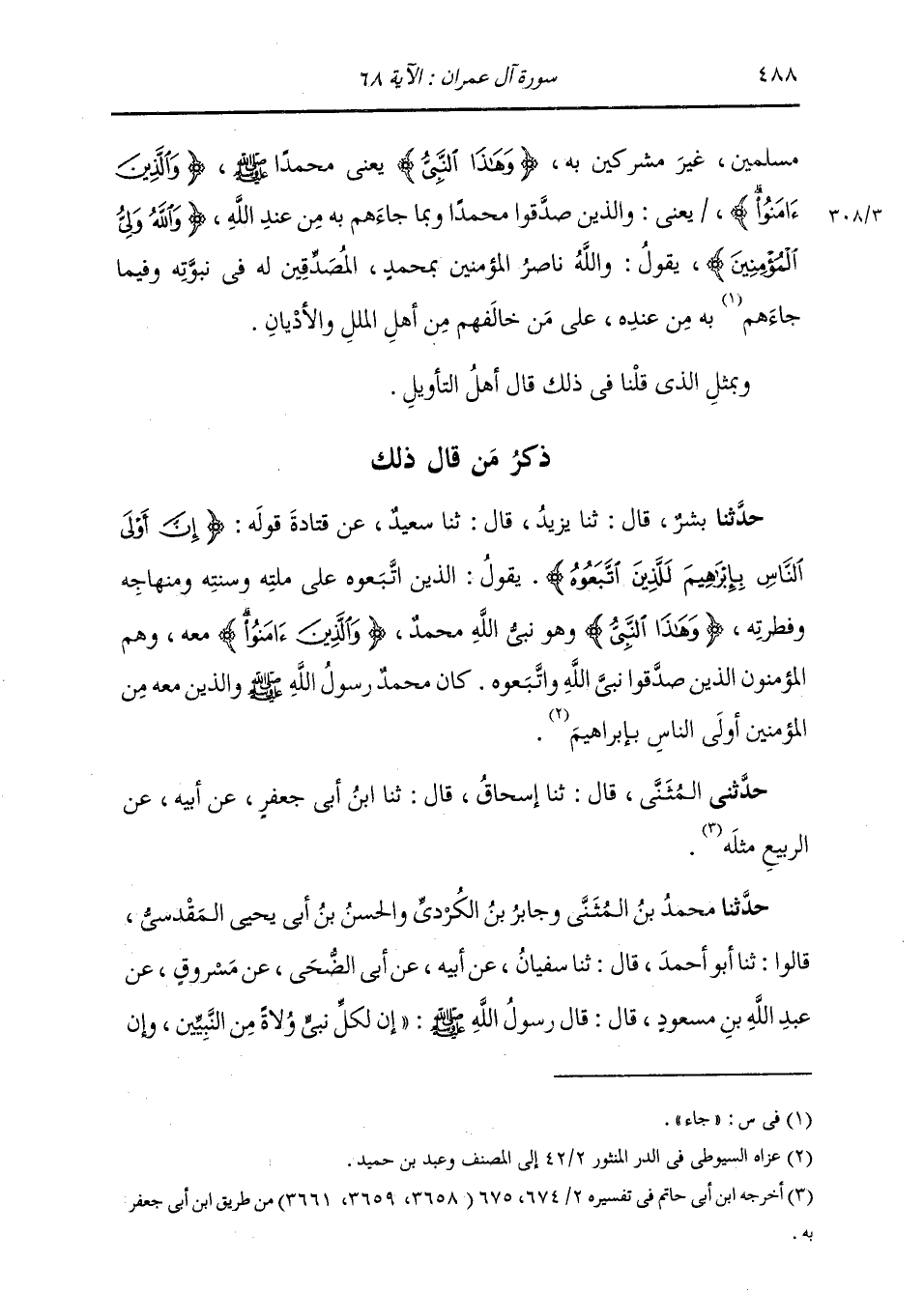 مُسْلِمَيْنِ غَيْرَ مُشْرِكِينَ بِهِ {وَهَذَا النَّبِيُّ} [آل عمران: 68] يَعْنِي مُحَمَّدًا صَلَّى اللهُ عَلَيْهِ وَسَلَّمَ. {وَالَّذِينَ آمَنُوا} [البقرة: 9] يَعْنِي وَالَّذِينَ صَدَّقُوا مُحَمَّدًا، وَبِمَا جَاءَهُمْ بِهِ مِنْ عِنْدِ اللَّهِ {وَاللَّهُ وَلِيُّ الْمُؤْمِنِينَ} [آل عمران: 68] يَقُولُ: وَاللَّهُ نَاصِرُ الْمُؤْمِنِينَ بِمُحَمَّدٍ الْمُصَدِّقِينَ لَهُ فِي نُبُوَّتِهِ، وَفِيمَا جَاءَهُمْ بِهِ مِنْ عِنْدِهِ عَلَى مَنْ خَالَفَهُمْ مِنْ أَهْلِ الْمِلَلِ وَالْأَدْيَانِ. وَبِمِثْلِ الَّذِي قُلْنَا فِي ذَلِكَ، قَالَ أَهْلُ التَّأْوِيلِ