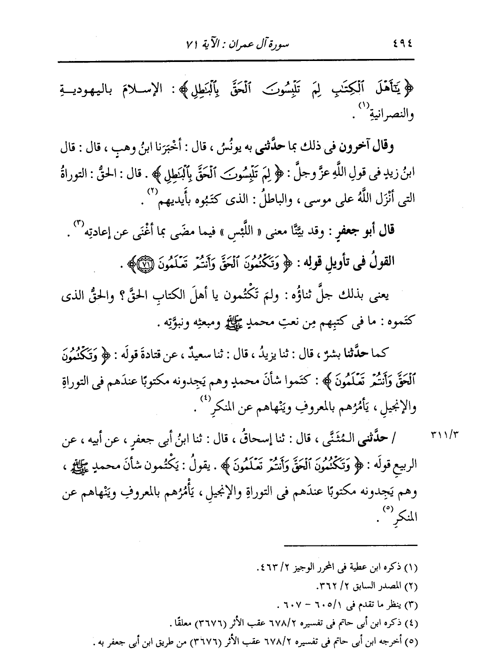 §الْقَوْلُ فِي تَأْوِيلِ قَوْلِهِ تَعَالَى: {وَتَكْتُمُونَ الْحَقَّ وَأَنْتُمْ تَعْلَمُونَ} [آل عمران: 71] يَعْنِي بِذَلِكَ جَلَّ ثناؤُهُ: وَلِمَ تَكْتُمُونَ يَا أَهْلَ الْكِتَابِ الْحَقَّ؟ وَالْحَقُّ الَّذِي كَتَمُوهُ مَا فِي كُتُبِهِمْ مِنْ نَعْتِ مُحَمَّدٍ صَلَّى اللهُ عَلَيْهِ وَسَلَّمَ وَمَبْعَثِهِ وَنُبُوَّتِهِ